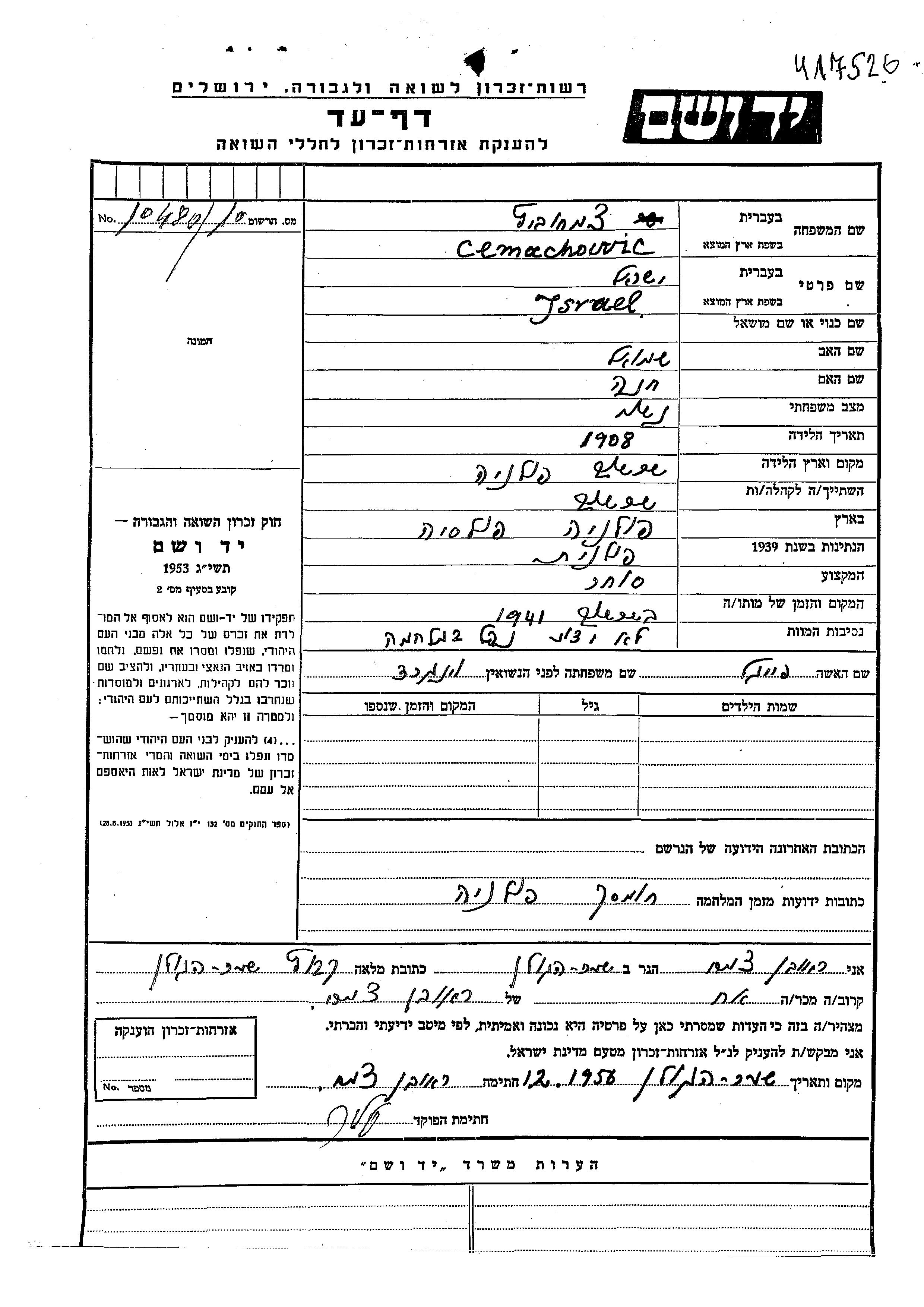 Israel Cemachowicz נולד בSzereszow שבפולין בשנת 1908 לשמואל וחנה. הוא היה סוחר ונשוי לפייגל לבית וינגרד. לפני מלחמת העולם השניה התגורר בSzereszow שבפולין. בזמן המלחמה הוא היה בChomsk שבפולין.