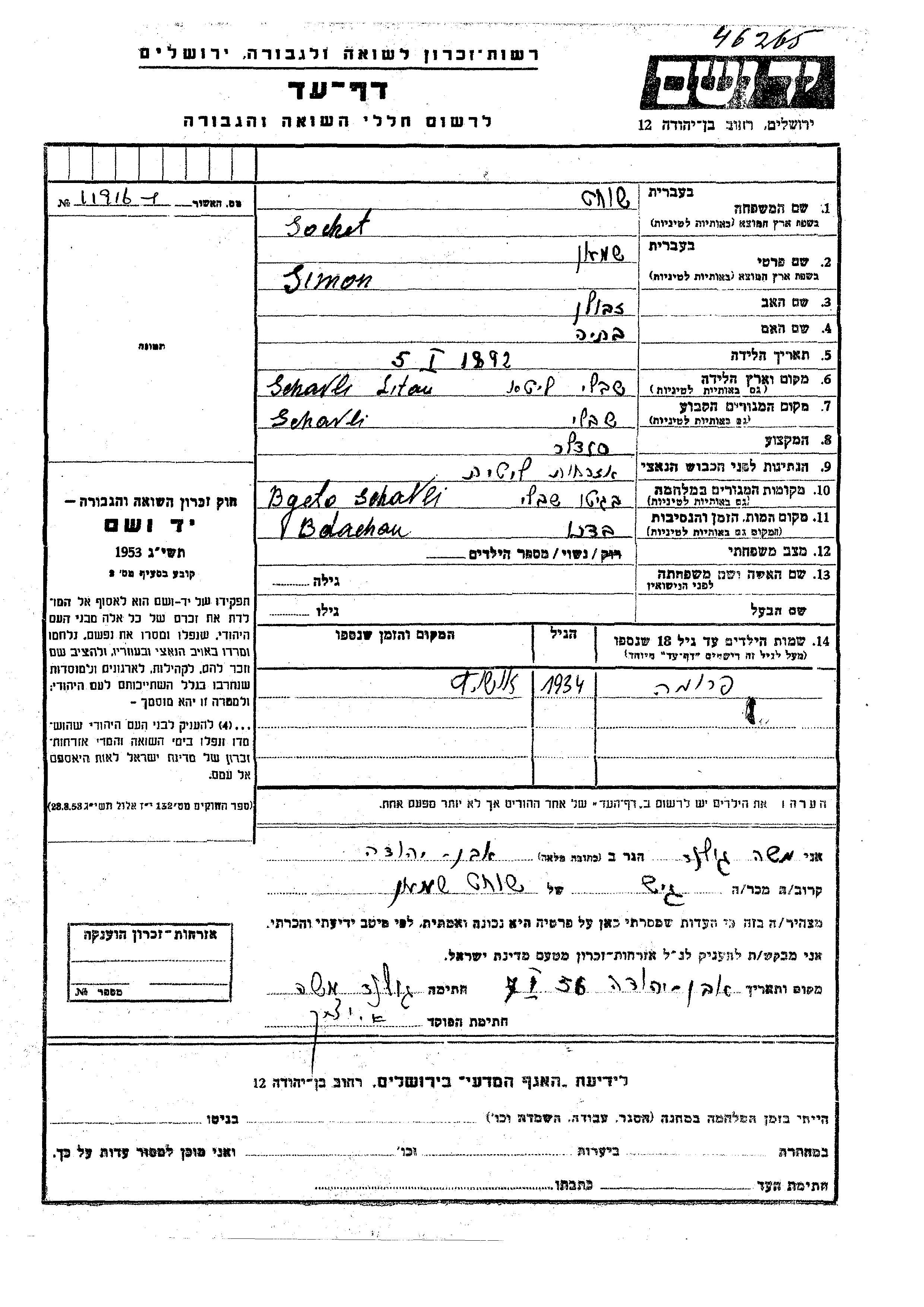 סימון Sochet נולד בSchavli שבליטא בשנת 1892 לזבולן ובתיה. הוא היה סנדלר ונשוי. לפני מלחמת העולם השניה התגורר בSchavli שבליטא. בזמן המלחמה הוא היה בSchavli שבליטא. סימון נרצח בשואה. מקום המוות: Dachau שבגרמניה.