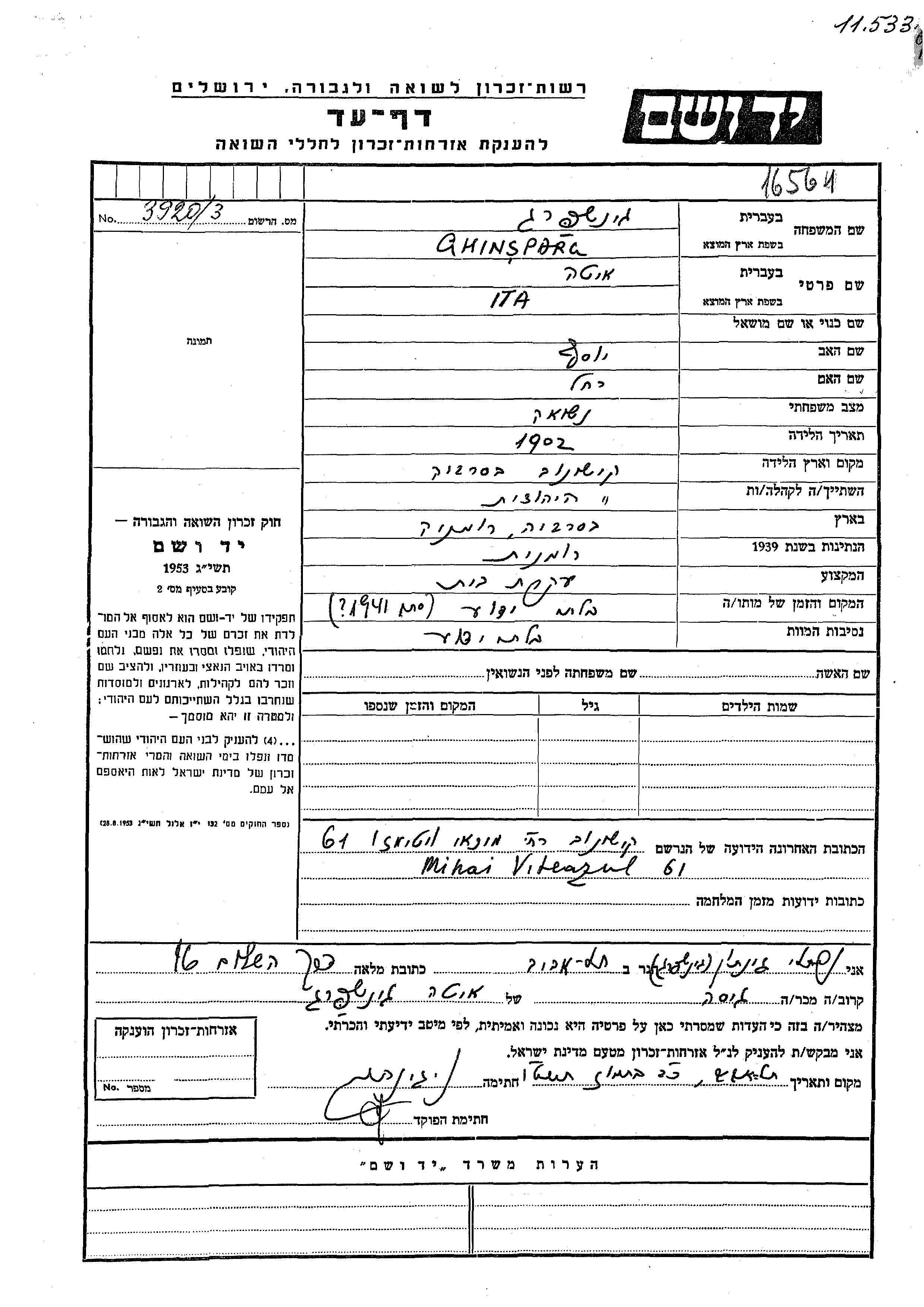 איטה Ghinsparg נולדה בKishinev שברומניה בשנת 1902 ליוסף ורחל. היא היתה עקרת בית. לפני מלחמת העולם השניה התגוררה בKishinev שברומניה. איטה נרצחה בשואה. מקום המוות: לא ידוע בשנת 1941.