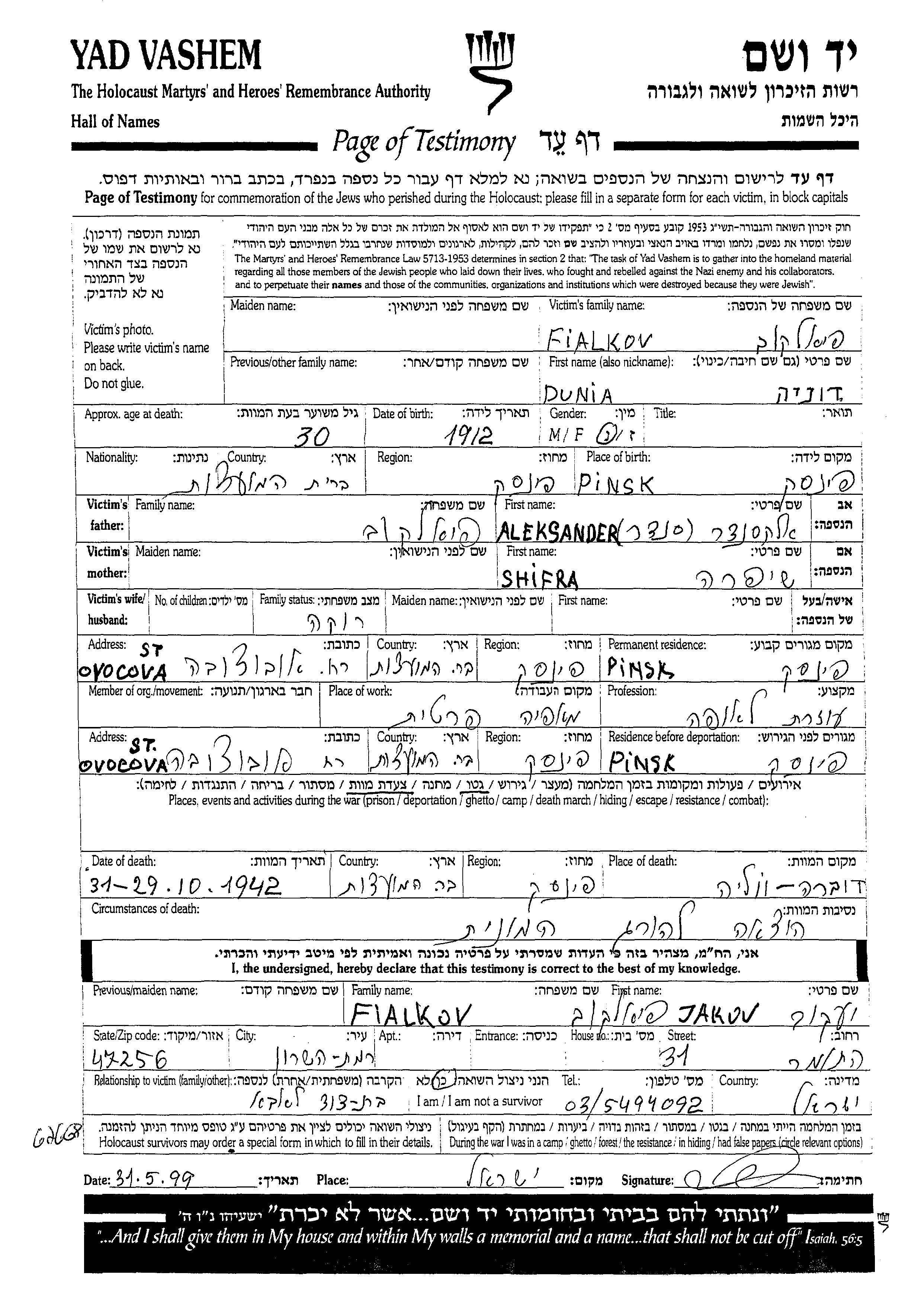Dunia דוניה פיאלקוב נולדה בPinsk שבפולין בשנת 1912 לאלקסנדר ושיפרה. היא היתה עוזרת לאופה ורווקה. לפני מלחמת העולם השניה התגוררה בPinsk שבפולין. בזמן המלחמה היא היתה בPinsk שבפולין.