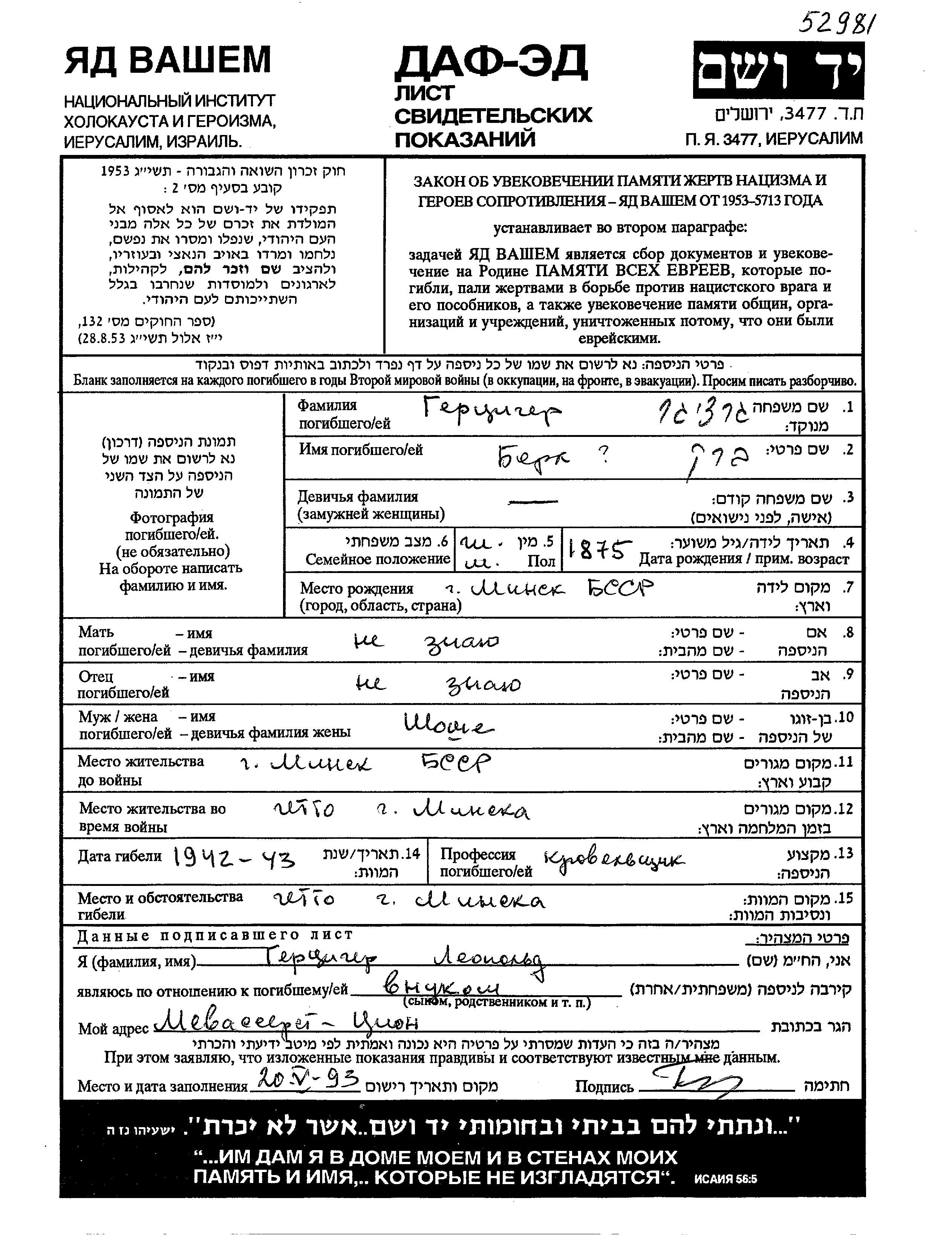 Berl גרציגר נולד בשנת 1875. הוא היה בנאי ונשוי לShoshe. לפני מלחמת העולם השניה התגורר בMinsk שבביאלורוסיה (ברה"מ). בזמן המלחמה הוא היה בMinsk שבביאלורוסיה (ברה"מ). הוא נרצח בשואה. מקום המוות: לא ידוע בשנת 1942.