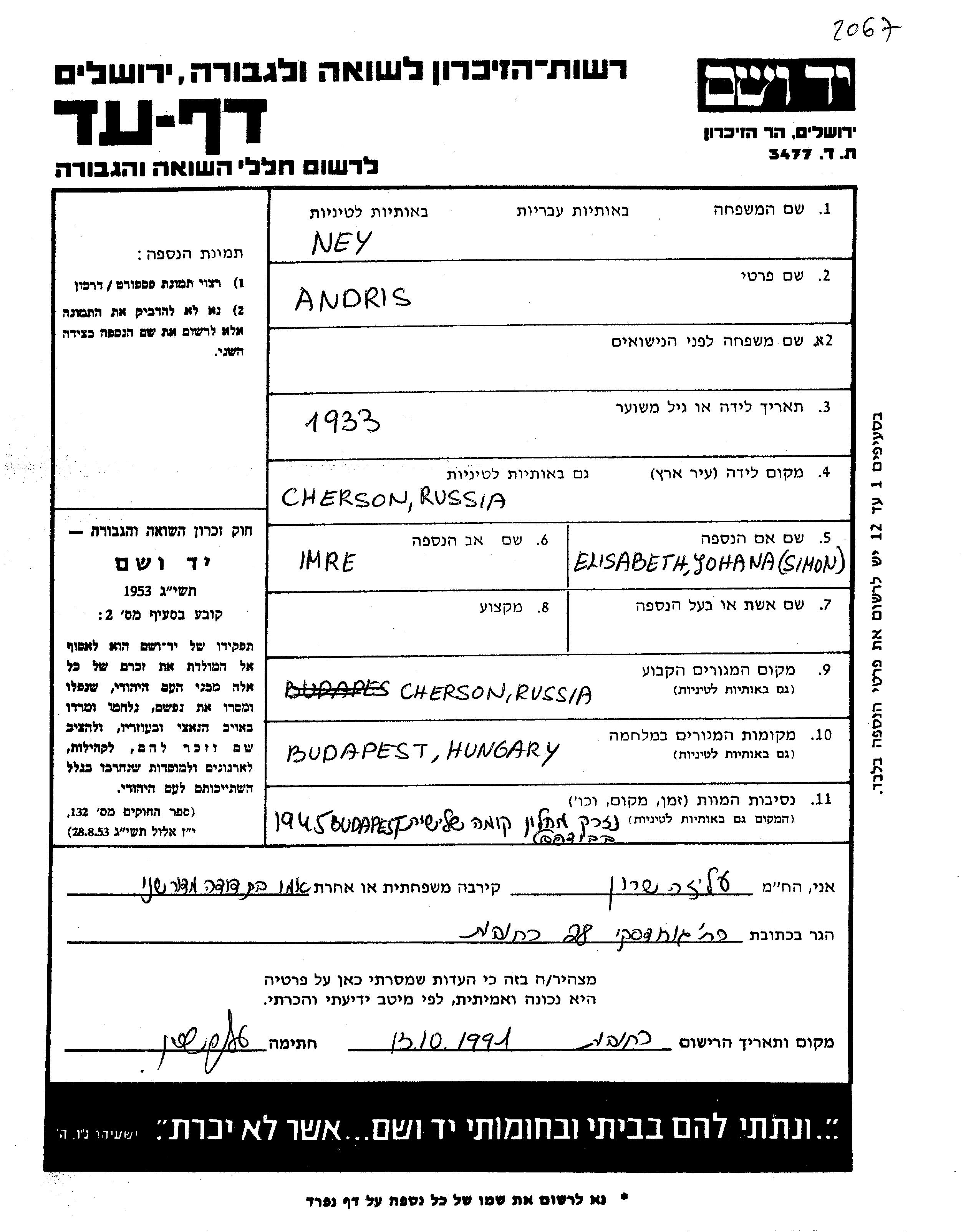 Andris Ney נולד בKherson שבאוקראינה (ברה"מ) בשנת 1933 לאימרה וElisabeth Johana לבית סימון. הוא היה ילד. לפני מלחמת העולם השניה התגורר בKherson שבאוקראינה (ברה"מ). בזמן המלחמה הוא היה בBudapest שבהונגריה.
