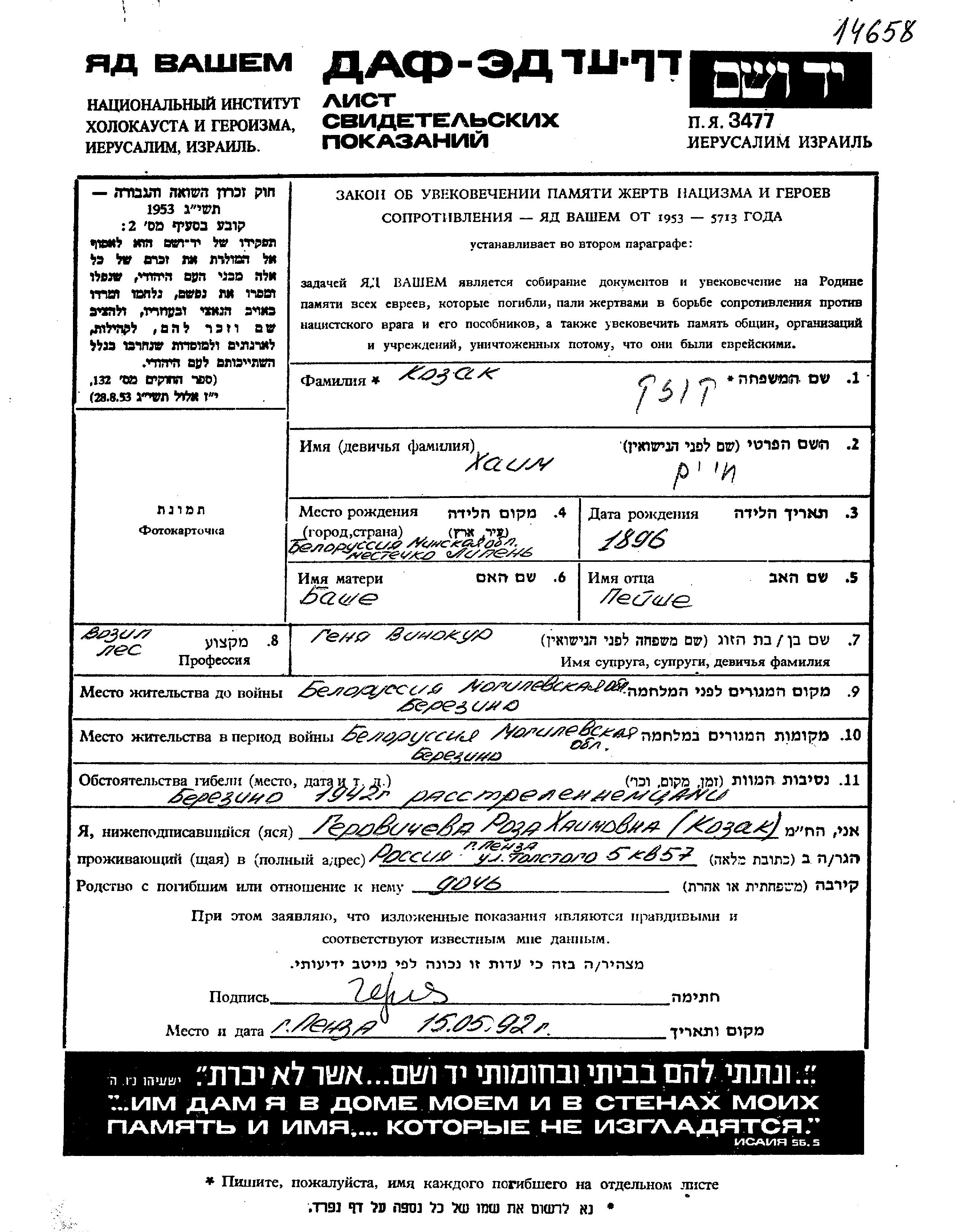 חיים Kozak נולד בLipen שבביאלורוסיה (ברה"מ) בשנת 1896 לPeishe וBashe. הוא היה עגלון ונשוי לGenia. לפני מלחמת העולם השניה התגורר בBerezino שבביאלורוסיה (ברה"מ). בזמן המלחמה הוא היה בBerezino שבביאלורוסיה (ברה"מ). חיים נרצח בשואה. מקום המוות: Berezino שבביאלורוסיה (ברה"מ) בשנת 1942.