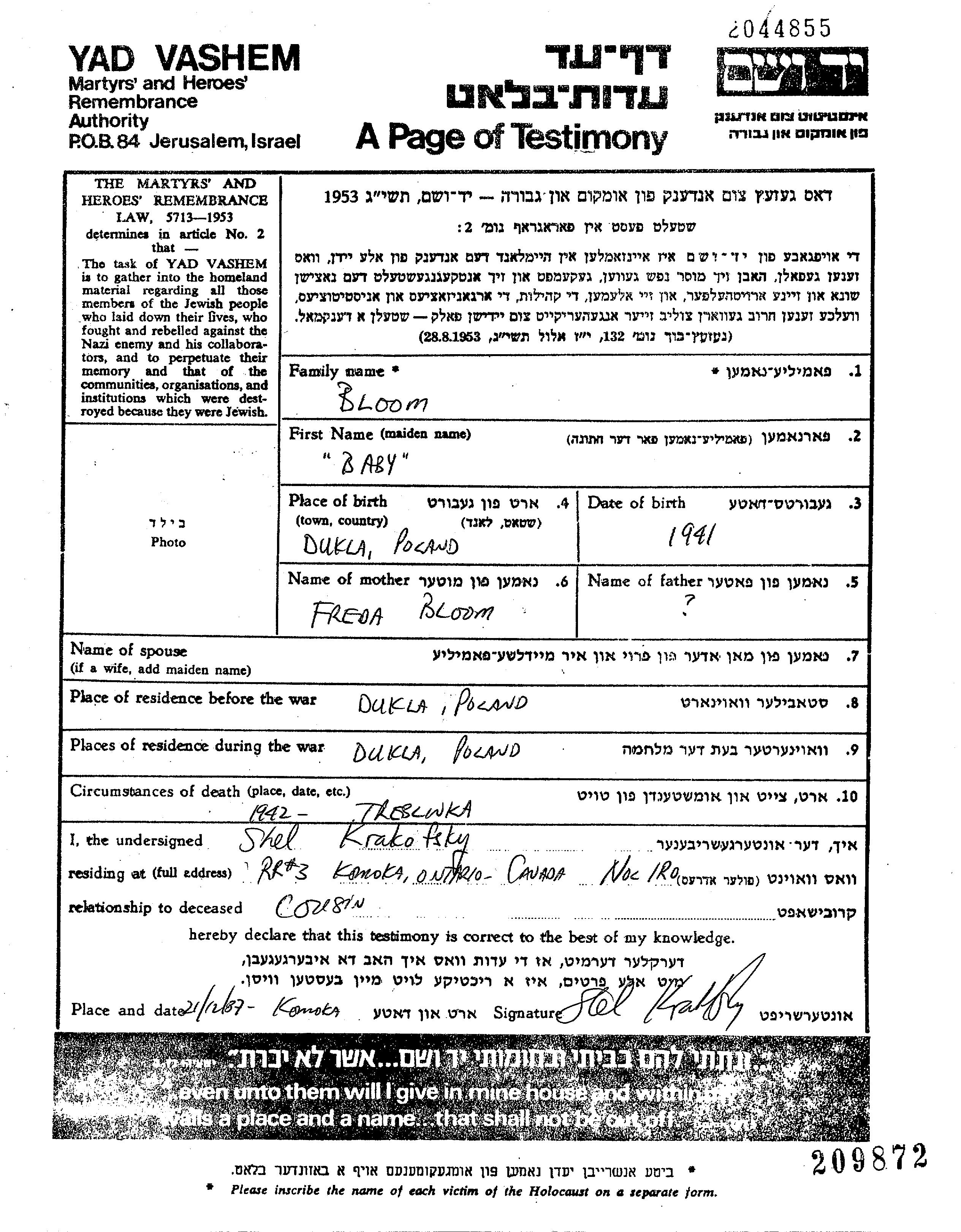 שם פרטי לא ידוע Bloom נולד/ה בDukla שבפולין בשנת 1941 לFreda. הוא/היא היה/היתה ילד/ילדה. לפני מלחמת העולם השניה התגורר/התגוררה בDukla שבפולין. בזמן המלחמה הוא/היא היה/היתה בDukla שבפולין.