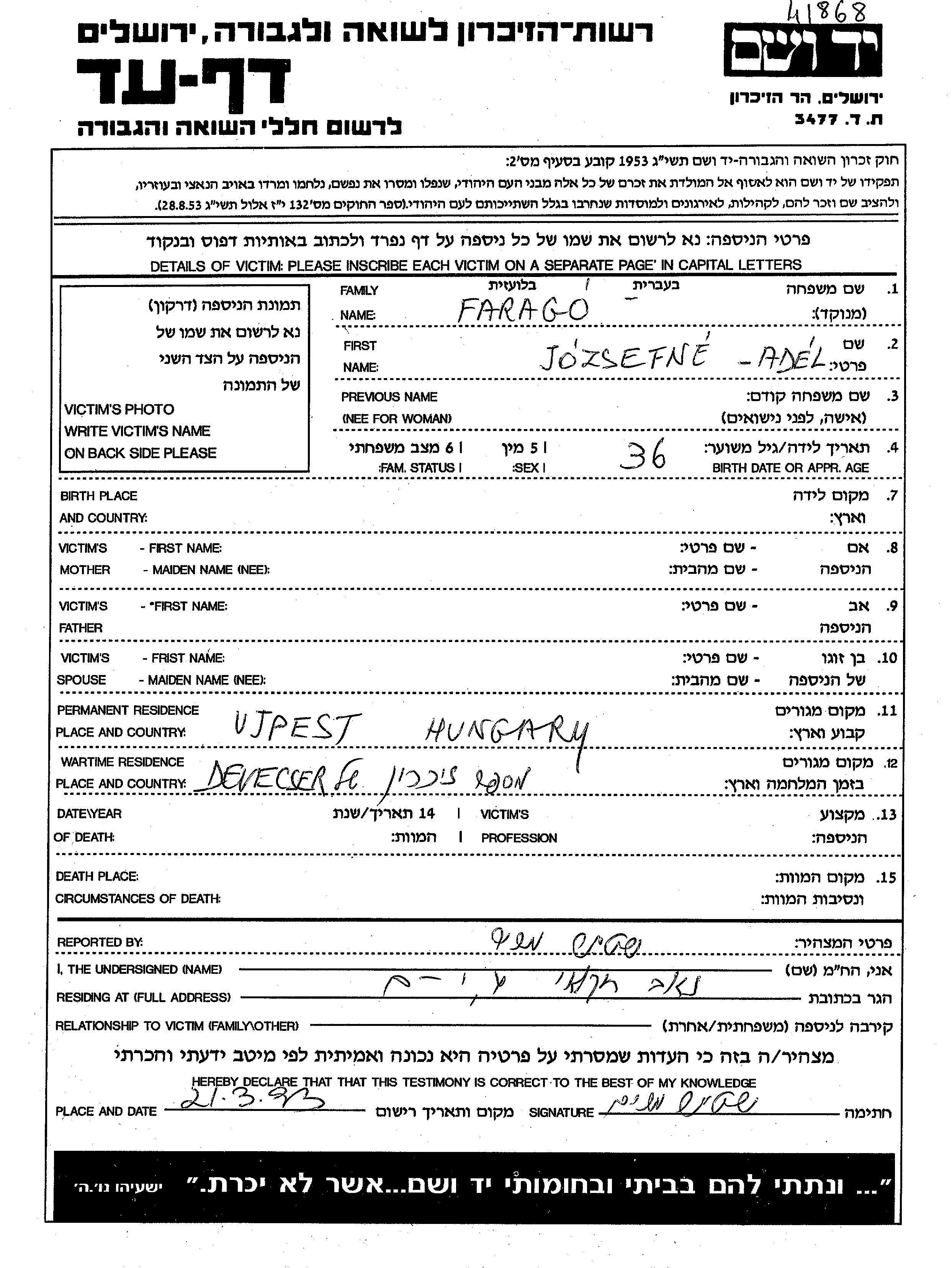 אדל פרגו. היא היתה נשואה לJoszef. לפני מלחמת העולם השניה התגוררה בUjpest שבהונגריה.