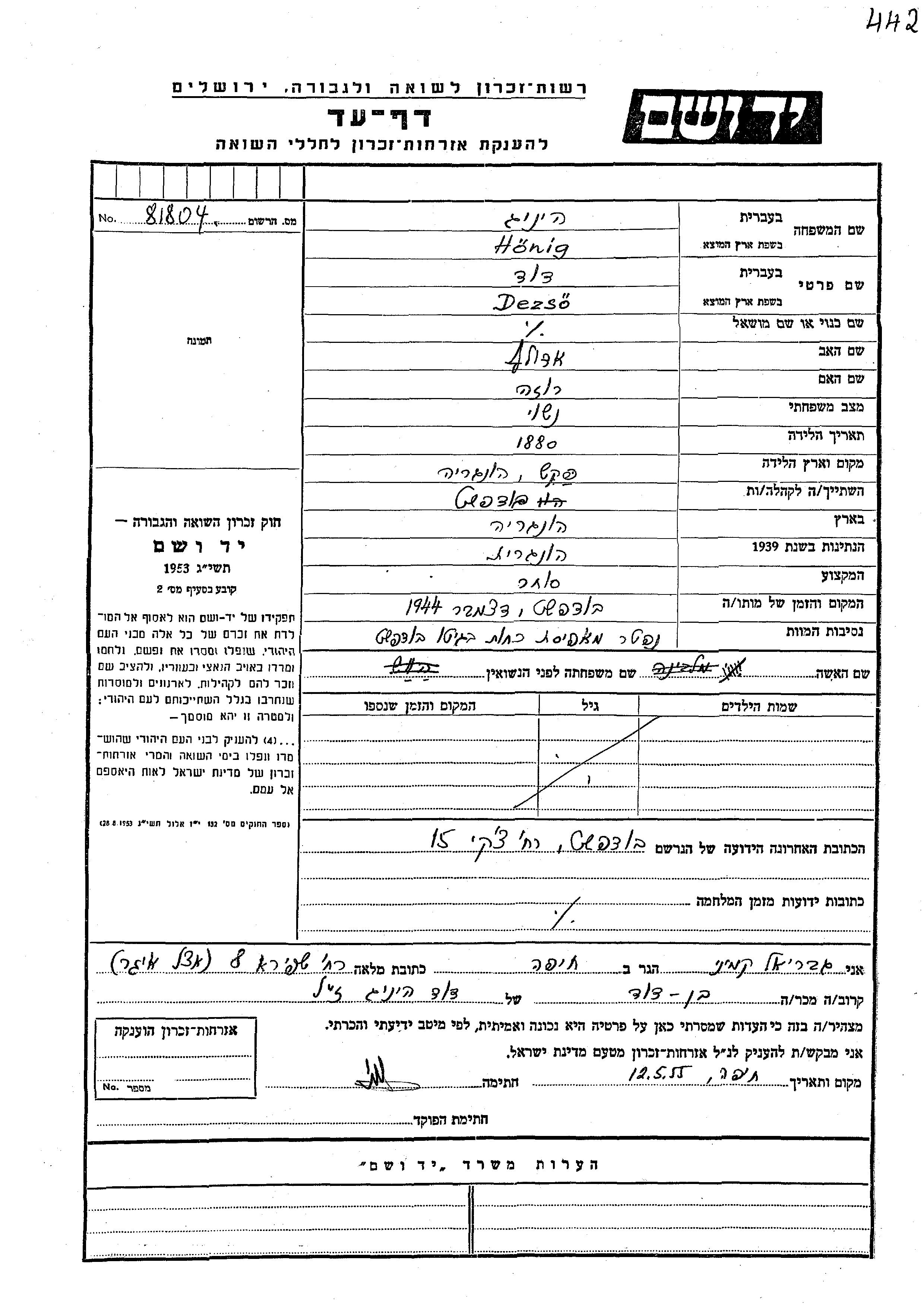 Dezso דוד היניג נולד בPaks שבהונגריה בשנת 1880 לאדולף ורוזה. הוא היה סוחר. לפני מלחמת העולם השניה התגורר בBudapest שבהונגריה. הוא נרצח בשואה. מקום המוות: Budapest שבהונגריה בשנת 12/1944.
