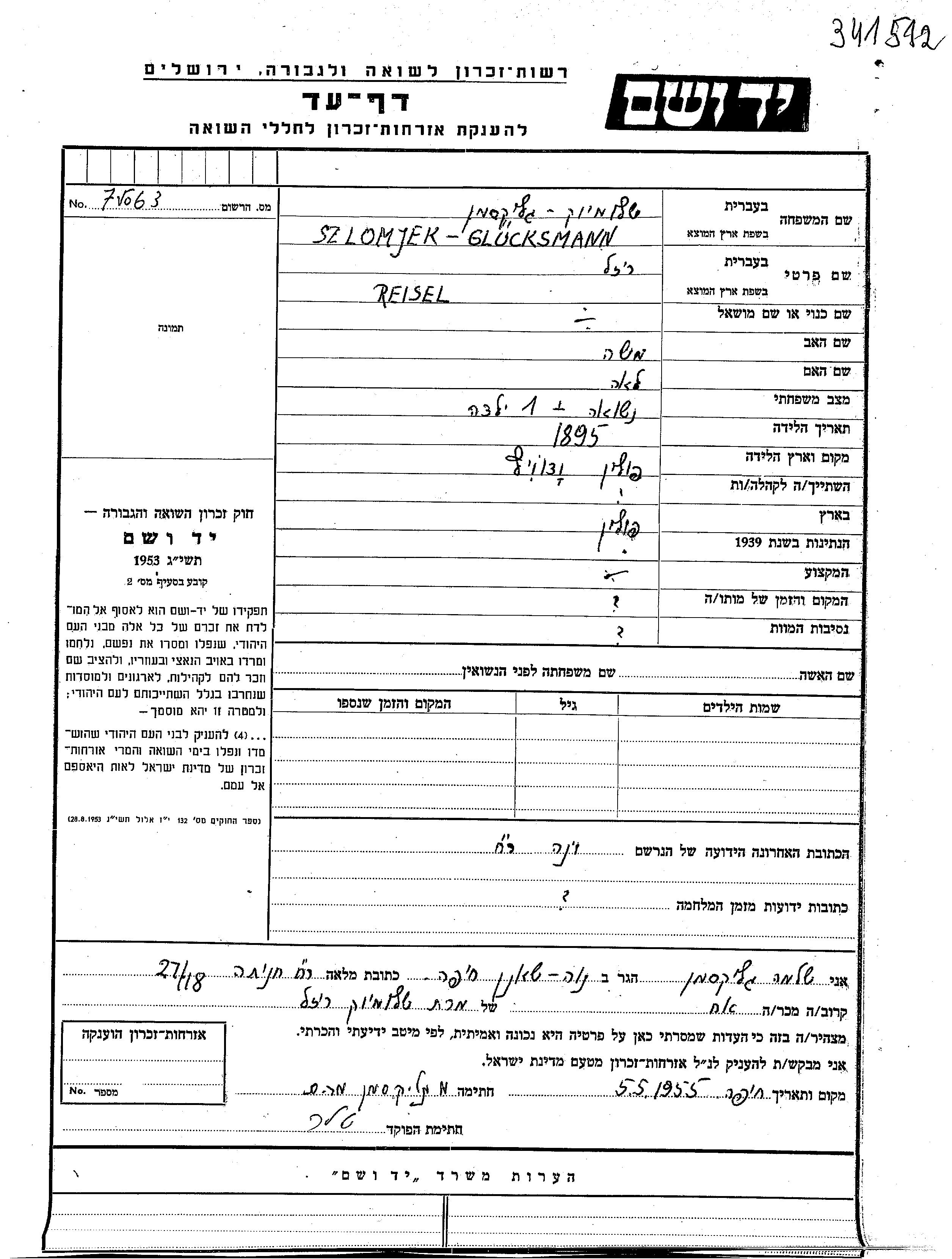 Reisel Szlomjek Glucksmann נולדה בWadowice שבפולין בשנת 1895 למשה ולאה. היא היתה נשואה. לפני מלחמת העולם השניה התגוררה בWien שבאוסטריה. בזמן המלחמה היא היתה בWien שבאוסטריה.