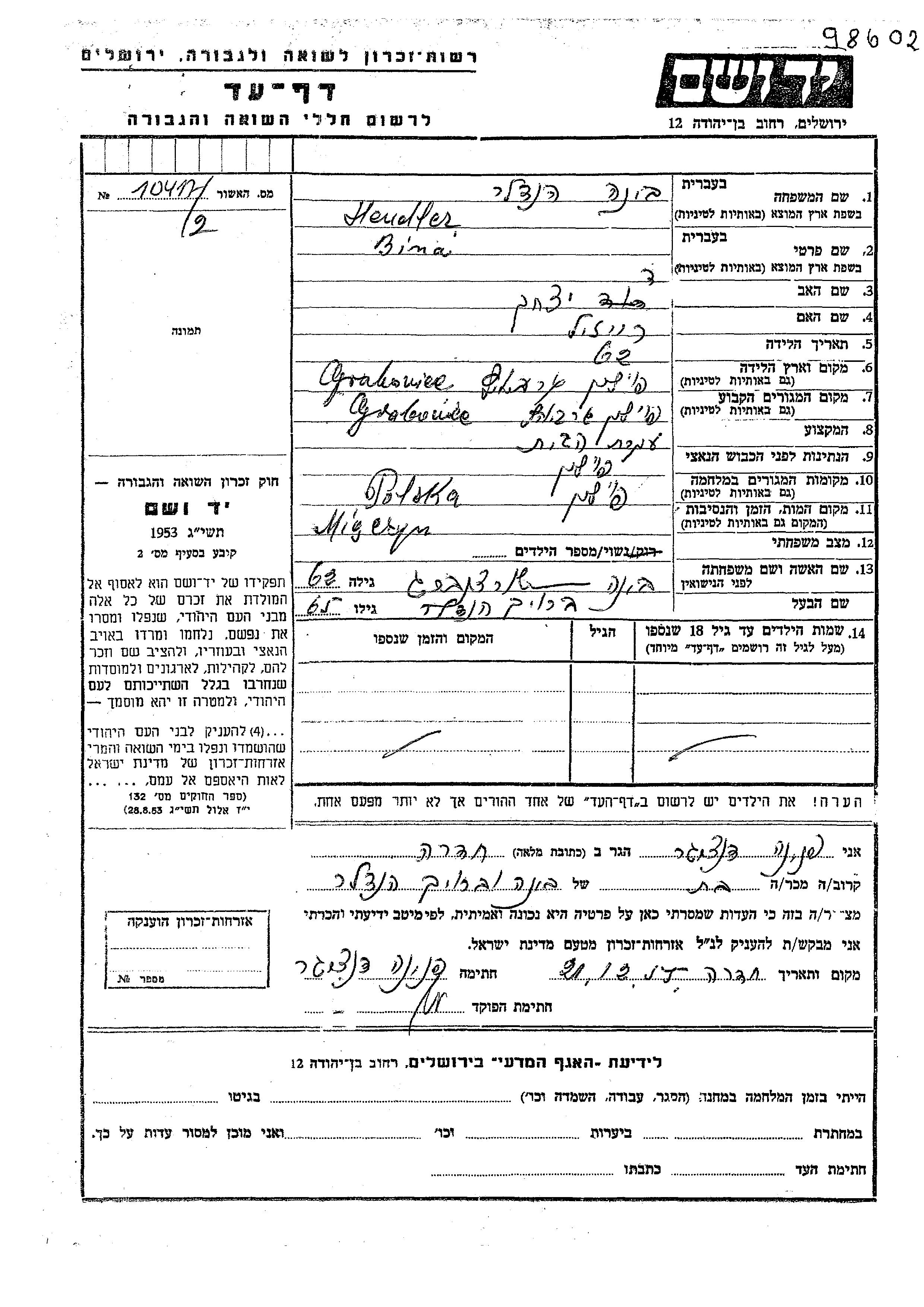 בינה הנדלר לבית שורצנברג נולדה בGrabowiec שבפולין ליצחק ורייזיל. היא היתה עקרת בית ונשואה לברוך. לפני מלחמת העולם השניה התגוררה בGrabowiec שבפולין. בזמן המלחמה היא היתה בGrabowiec שבפולין. בינה נרצחה בשואה.