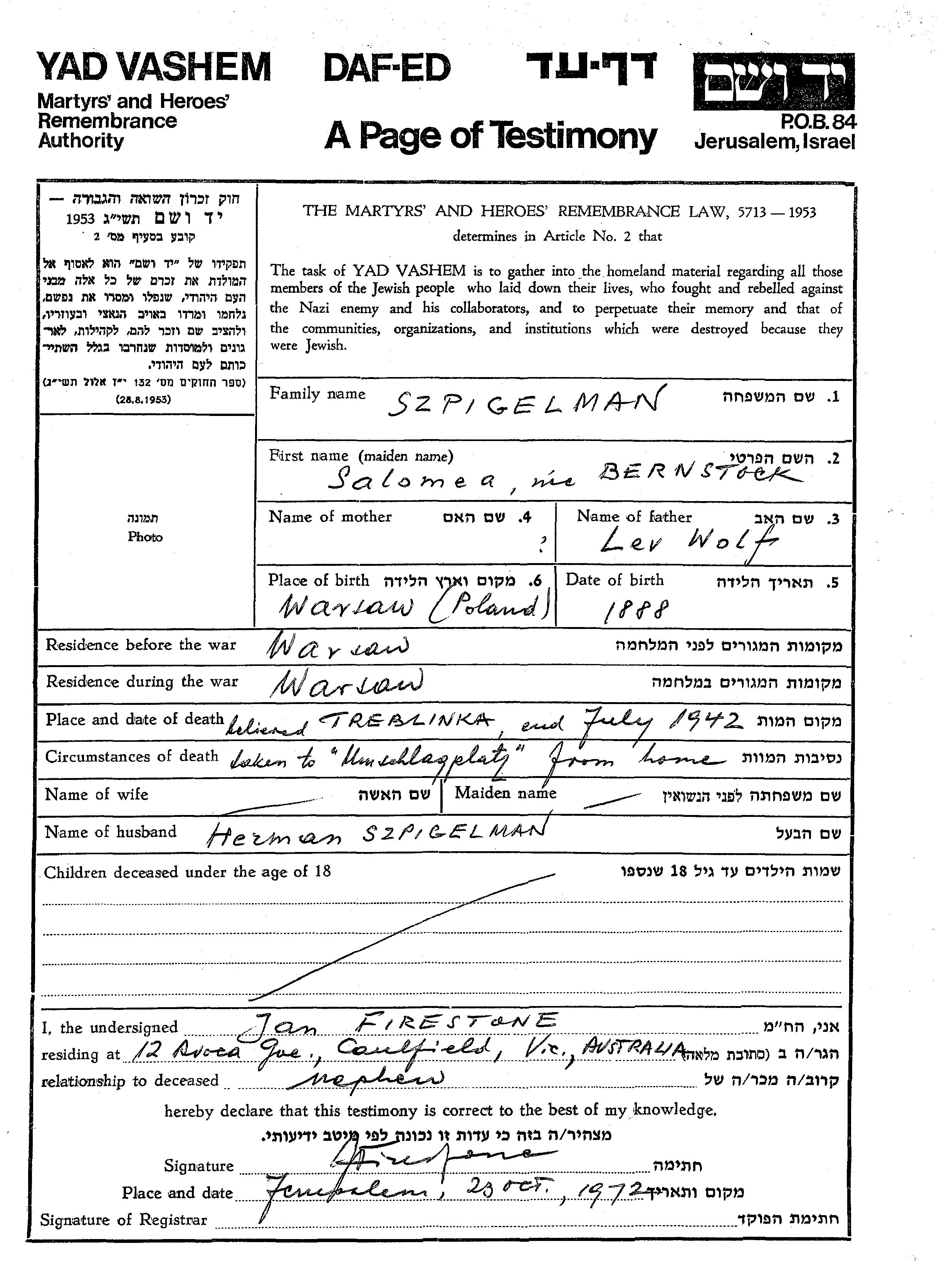 Salomea Szpigelman לבית Bernstock נולדה בWarszawa שבפולין בשנת 1888 ללב Wolf. לפני מלחמת העולם השניה התגוררה בWarszawa שבפולין. בזמן המלחמה היא היתה בWarszawa שבפולין.