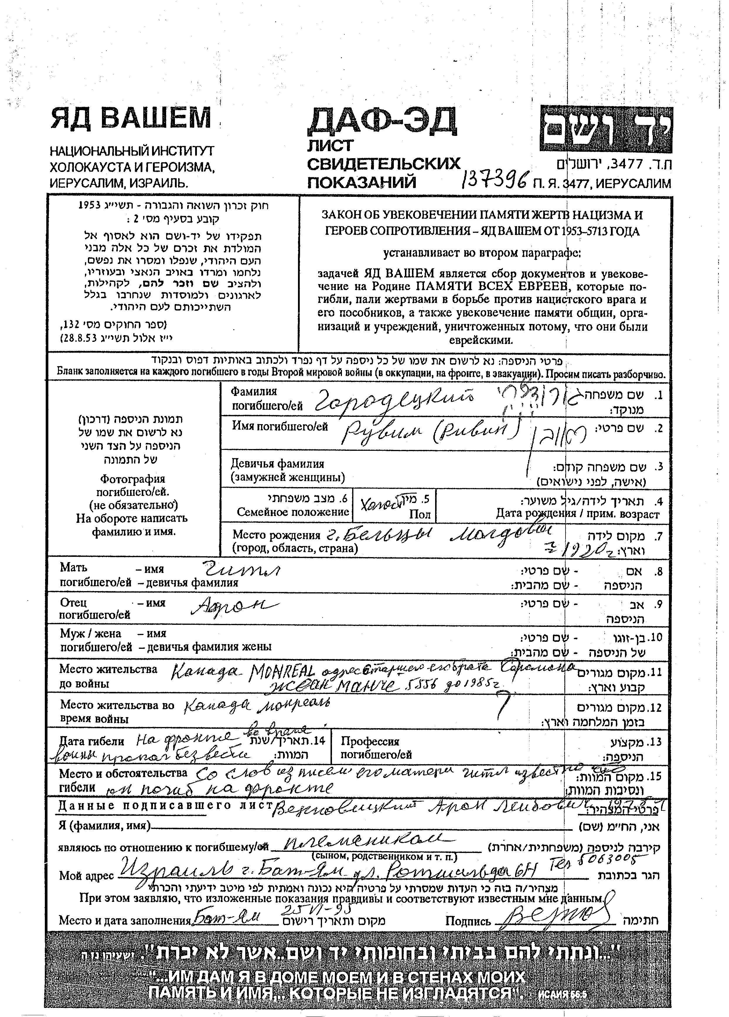Ruvim גורודצקי נולד בBalti שברומניה בשנת 1920 לAaron וGitl. הוא היה רווק. בזמן המלחמה הוא היה בצבא הסובייטי.