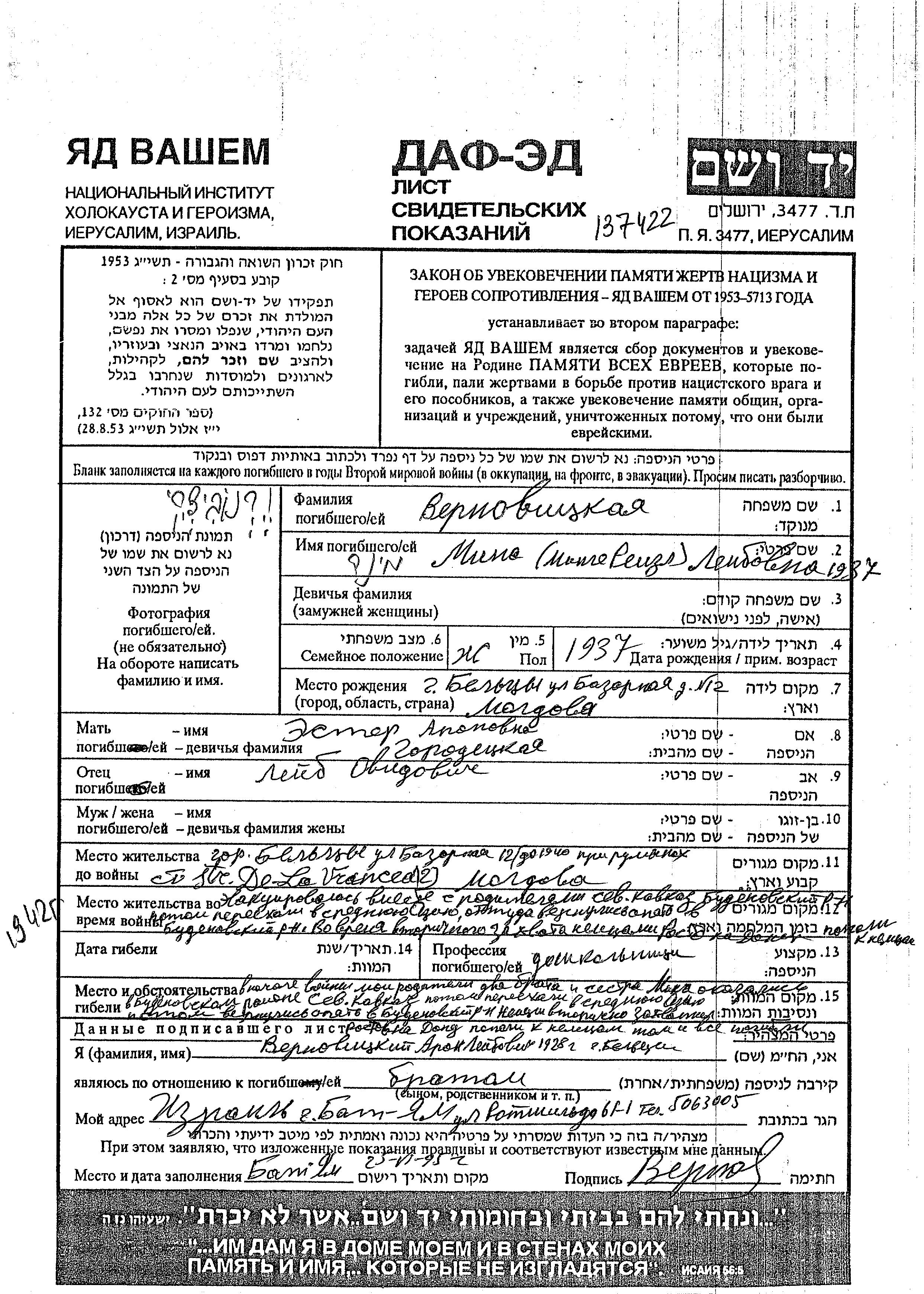 Reizl מינה Vernovitzki נולדה בBalti שברומניה בשנת 1937 ללייב ואסתר לבית גורודצקי. היא היתה ילדה. לפני מלחמת העולם השניה התגוררה בBalti שברומניה. בזמן המלחמה היא היתה בCentral Asia Region שבברית המועצות.