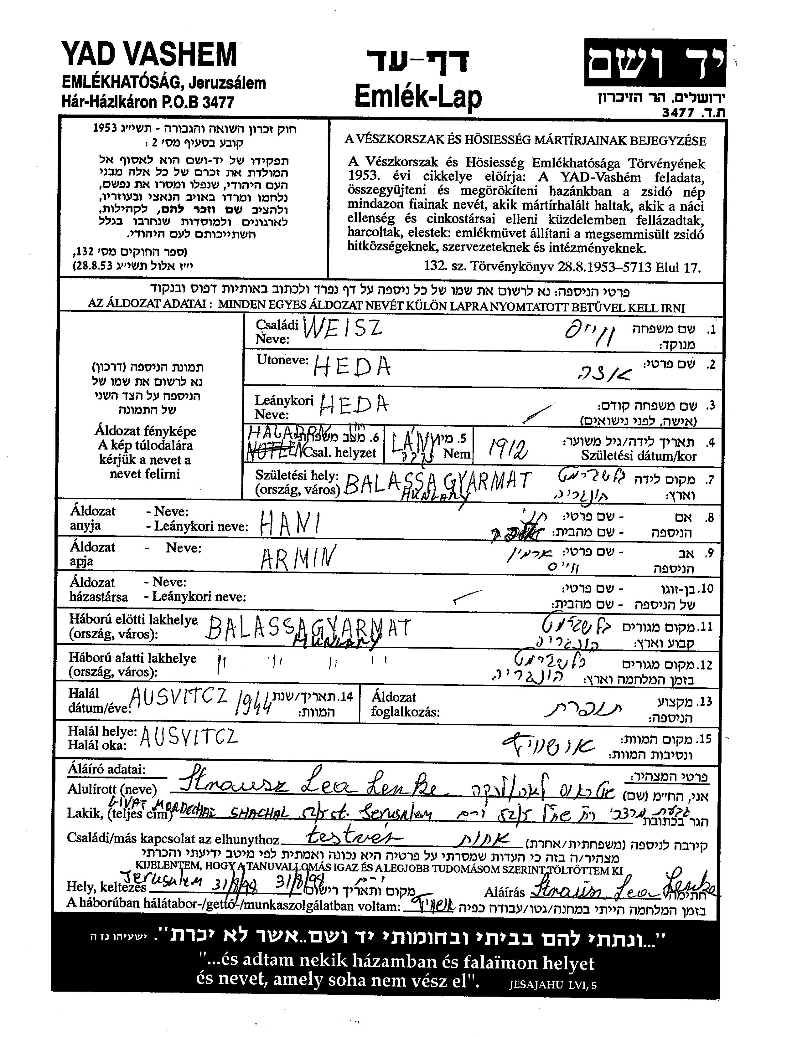 אדה הדה Weisz נולדה בBalassagyarmat שבהונגריה בשנת 1912 לארמין וHani חני. היא היתה תופרת. לפני מלחמת העולם השניה התגוררה בBalassagyarmat שבהונגריה. בזמן המלחמה היא היתה בBalassagyarmat שבהונגריה.