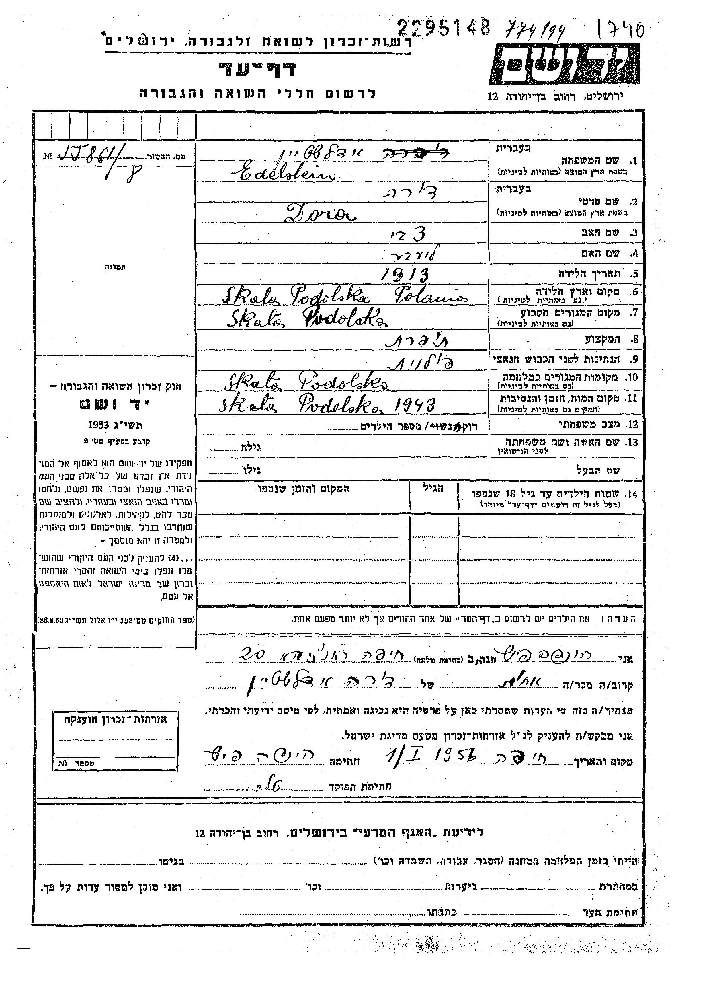 דורה Edelstein נולדה בSkala Podolska שבפולין בשנת 1913 לצבי וליעבע. היא היתה תופרת ורווקה. לפני מלחמת העולם השניה התגוררה בSkala Podolska שבפולין. בזמן המלחמה היא היתה בSkala Podolska שבפולין.