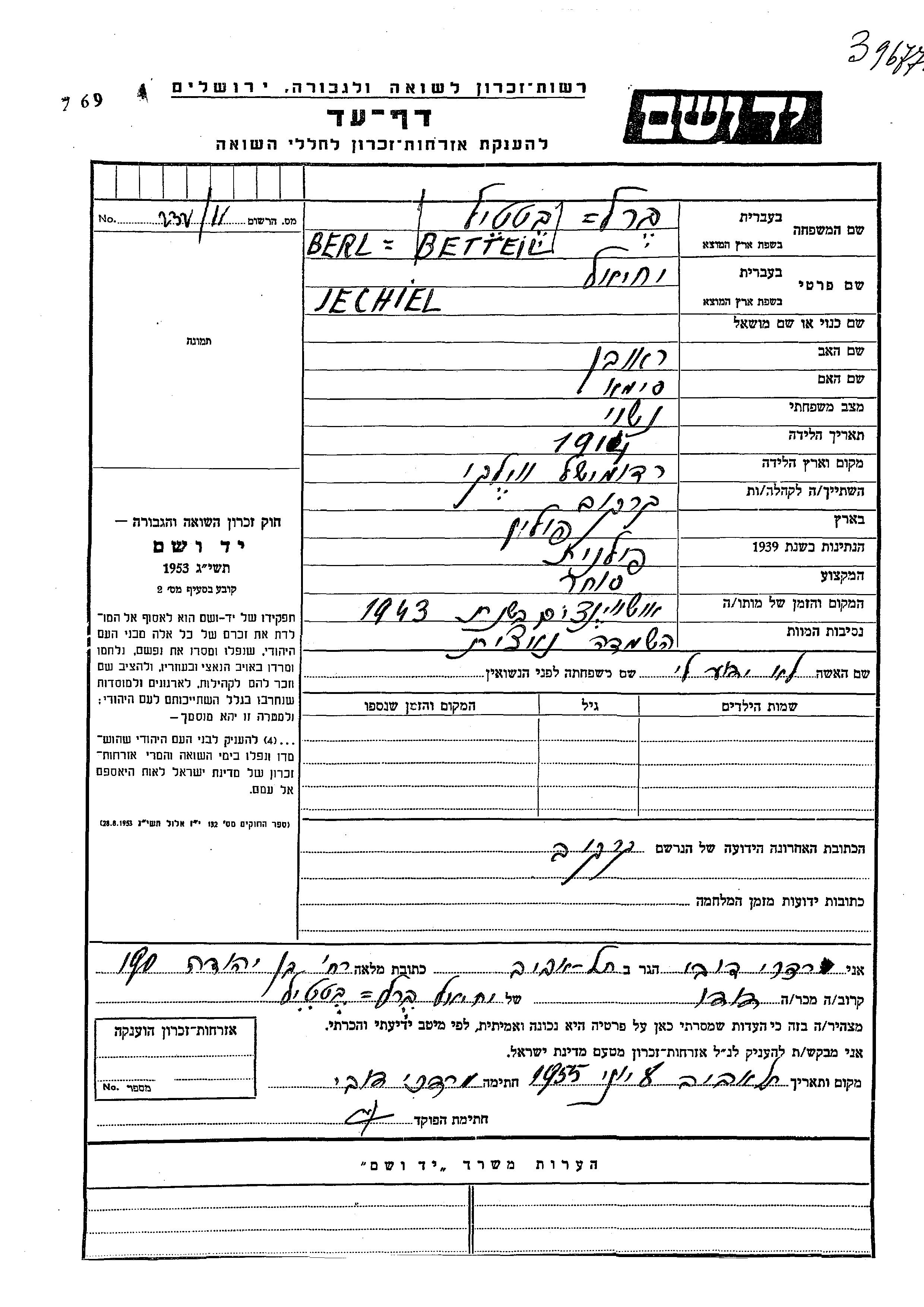 Jechiel Berl Betteil נולד בRadomishl Vyelki שבפולין בשנת 1914 לראובן וסימא. הוא היה סוחר ונשוי. לפני מלחמת העולם השניה התגורר בRadomishl Vyelki שבפולין. בזמן המלחמה הוא היה בKrakow שבפולין. הוא נרצח בשואה. מקום המוות: Auschwitz שבפולין בשנת 1943.
