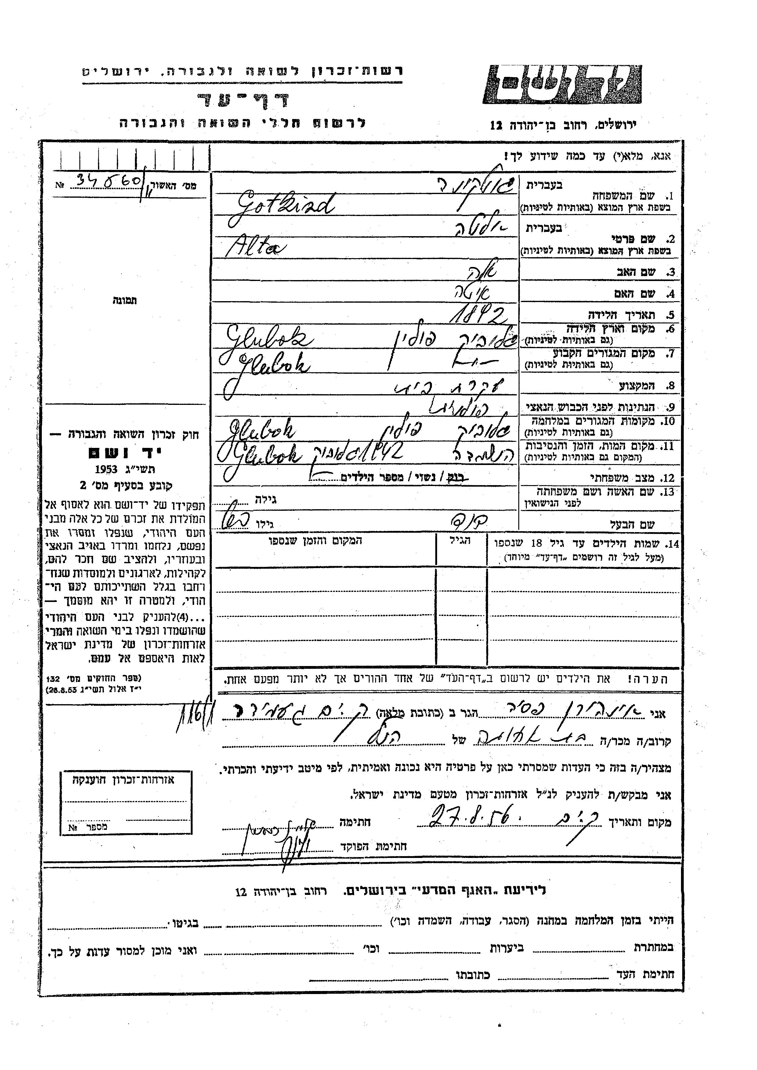 Gotkind Alta 1892 Glubok, פולין דף-עד
