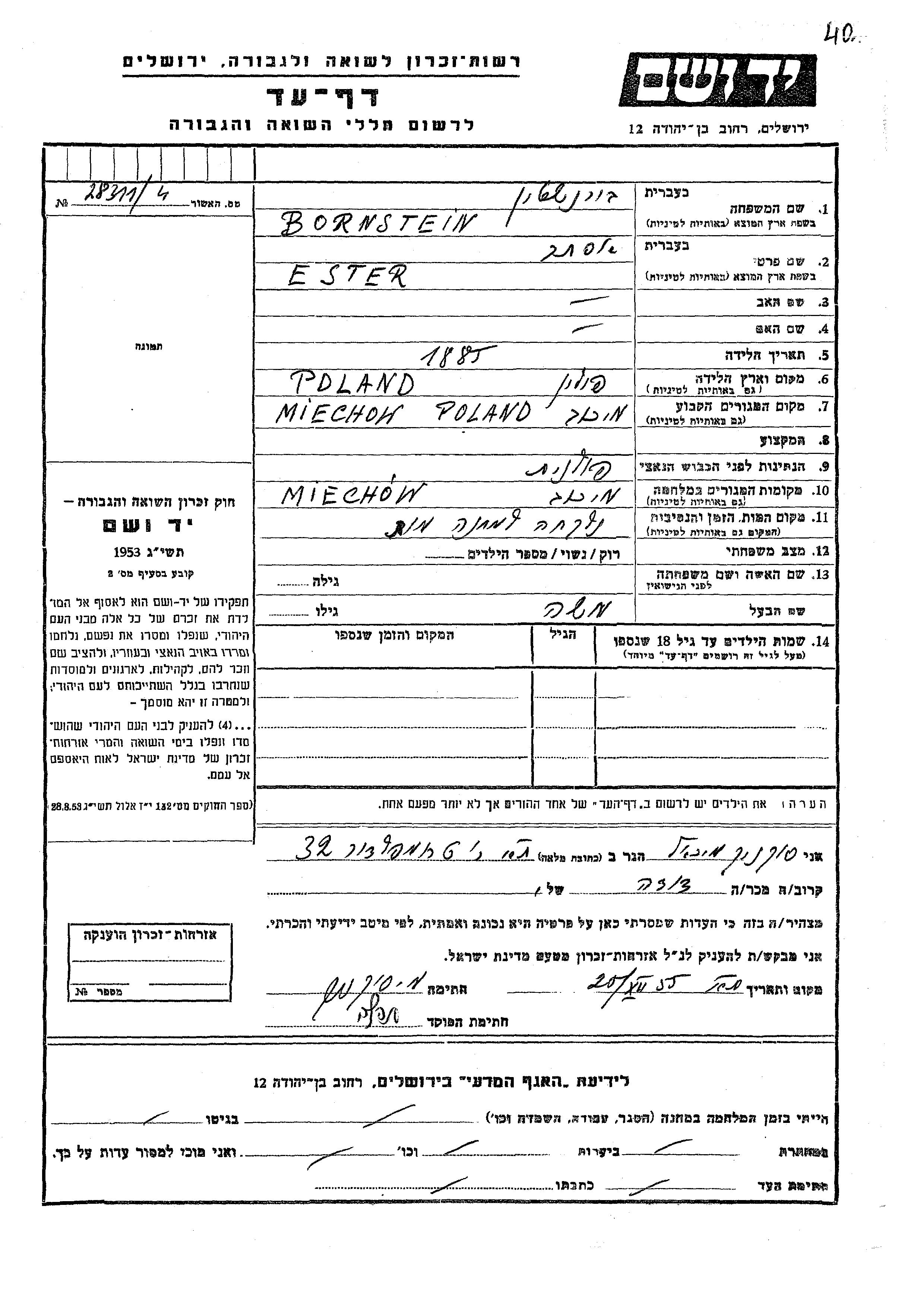 Bornstein אסתר 1885 Miechow, פולין דף-עד