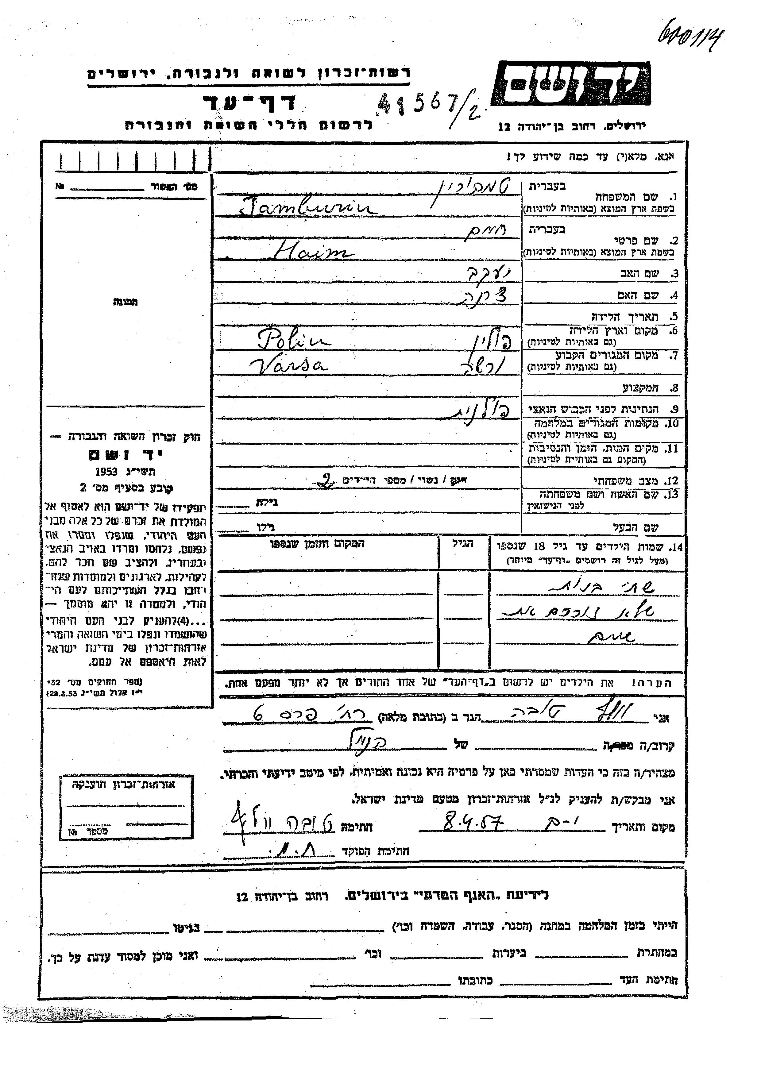 Haim טמבורין נולד בפולין ליעקב וצ'רנה. הוא היה נשוי. לפני מלחמת העולם השניה התגורר בWarsaw שבפולין.