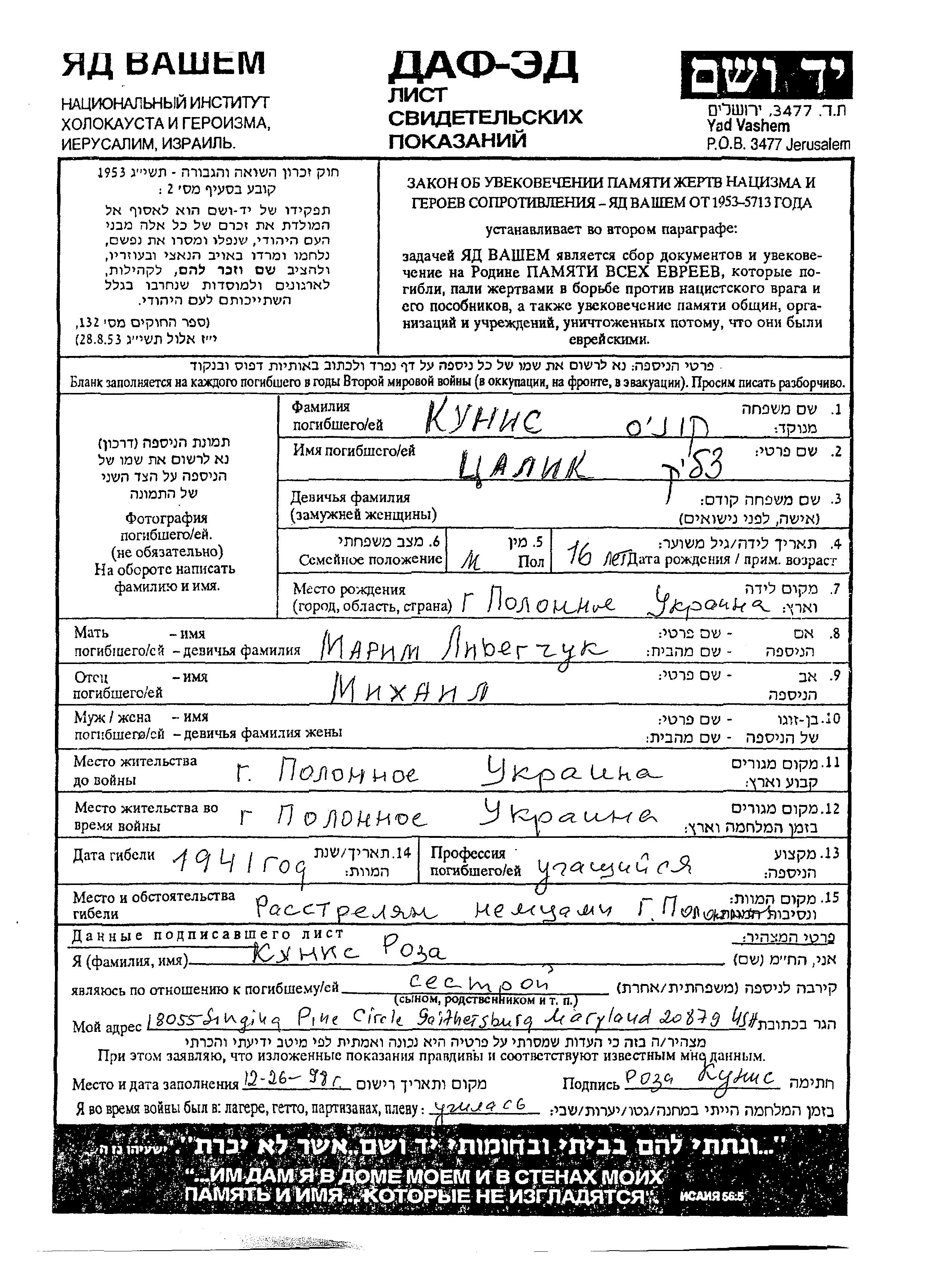 צליק נרצח בשואה. מקום המוות: Polonnoye שבאוקראינה (ברה"מ) בשנת 1941.