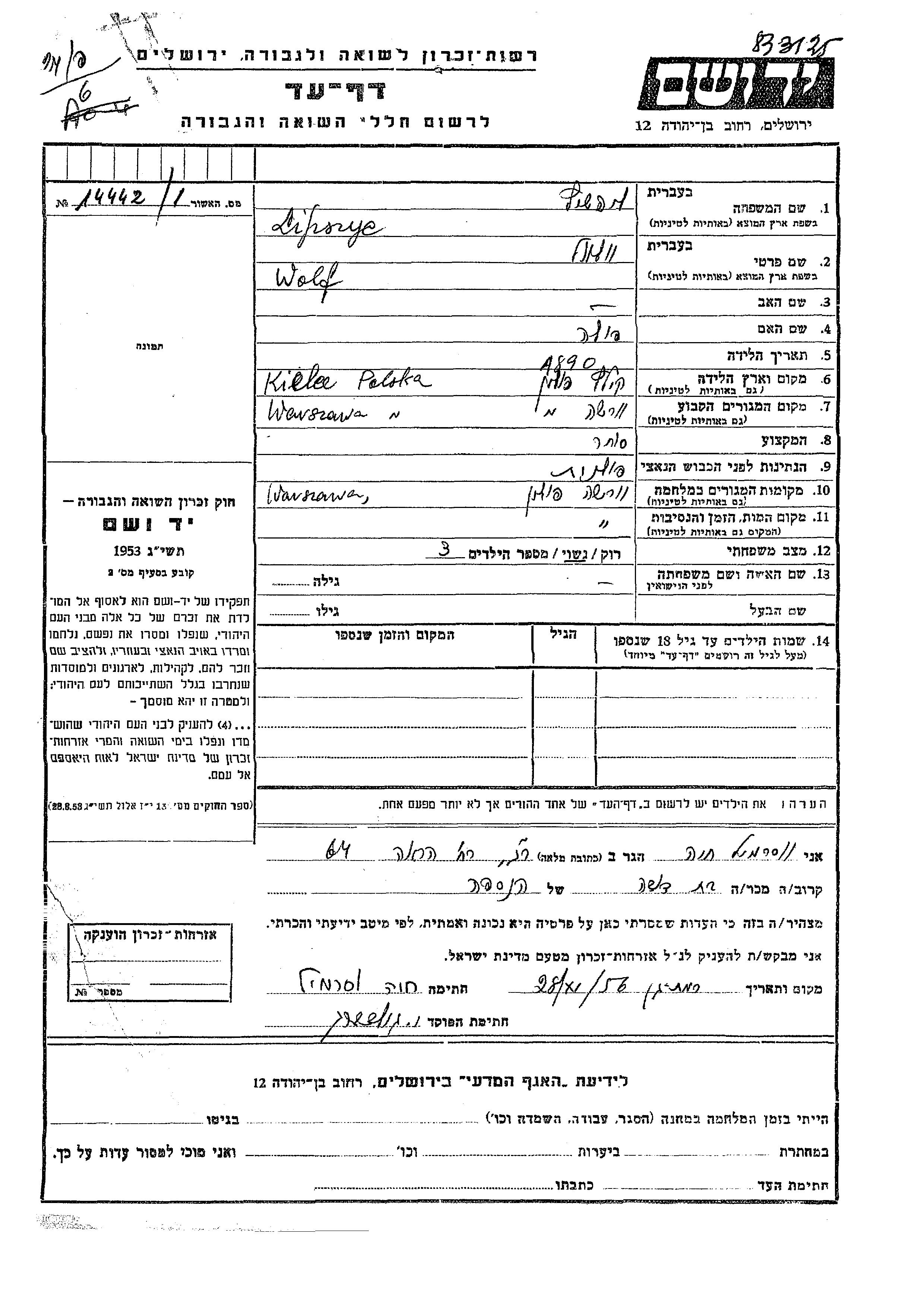 Wolf Lipszyc נולד בKielce שבפולין בשנת 1890 לפולה. הוא היה סוחר ונשוי. לפני מלחמת העולם השניה התגורר בVarsha שבפולין. בזמן המלחמה הוא היה בVarsha שבפולין. הוא נרצח בשואה. מקום המוות: Varsha שבפולין.