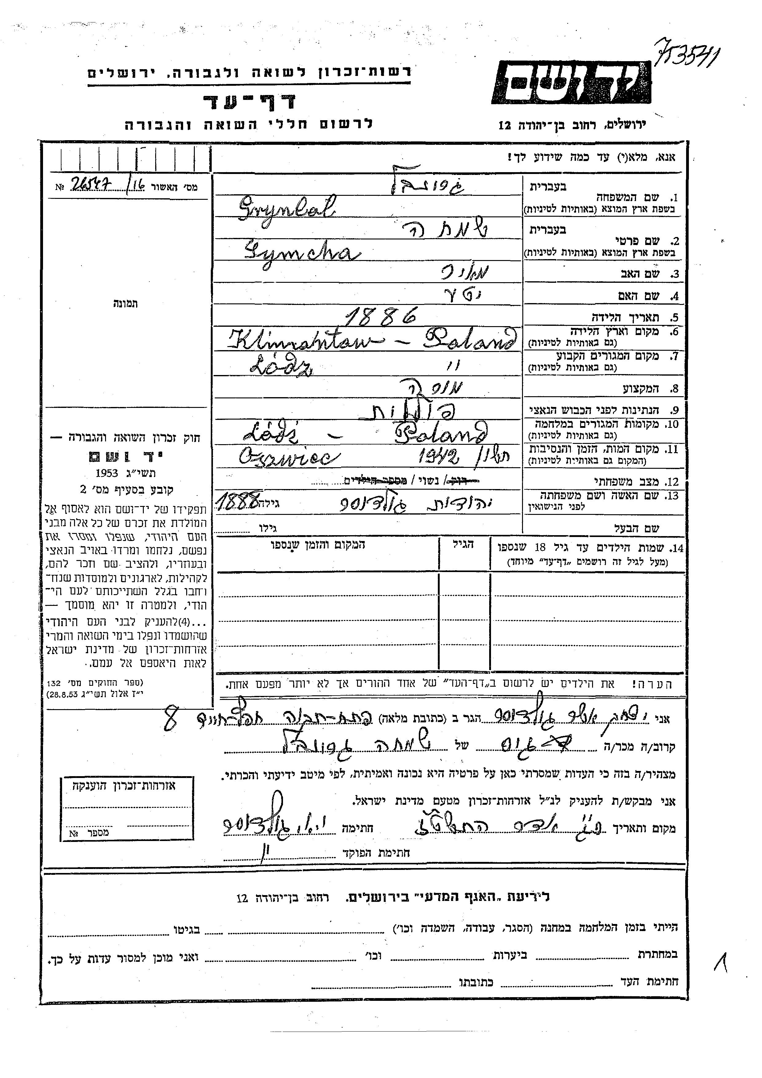 Grynbal Symcha 1886 Lodz, פולין דף-עד