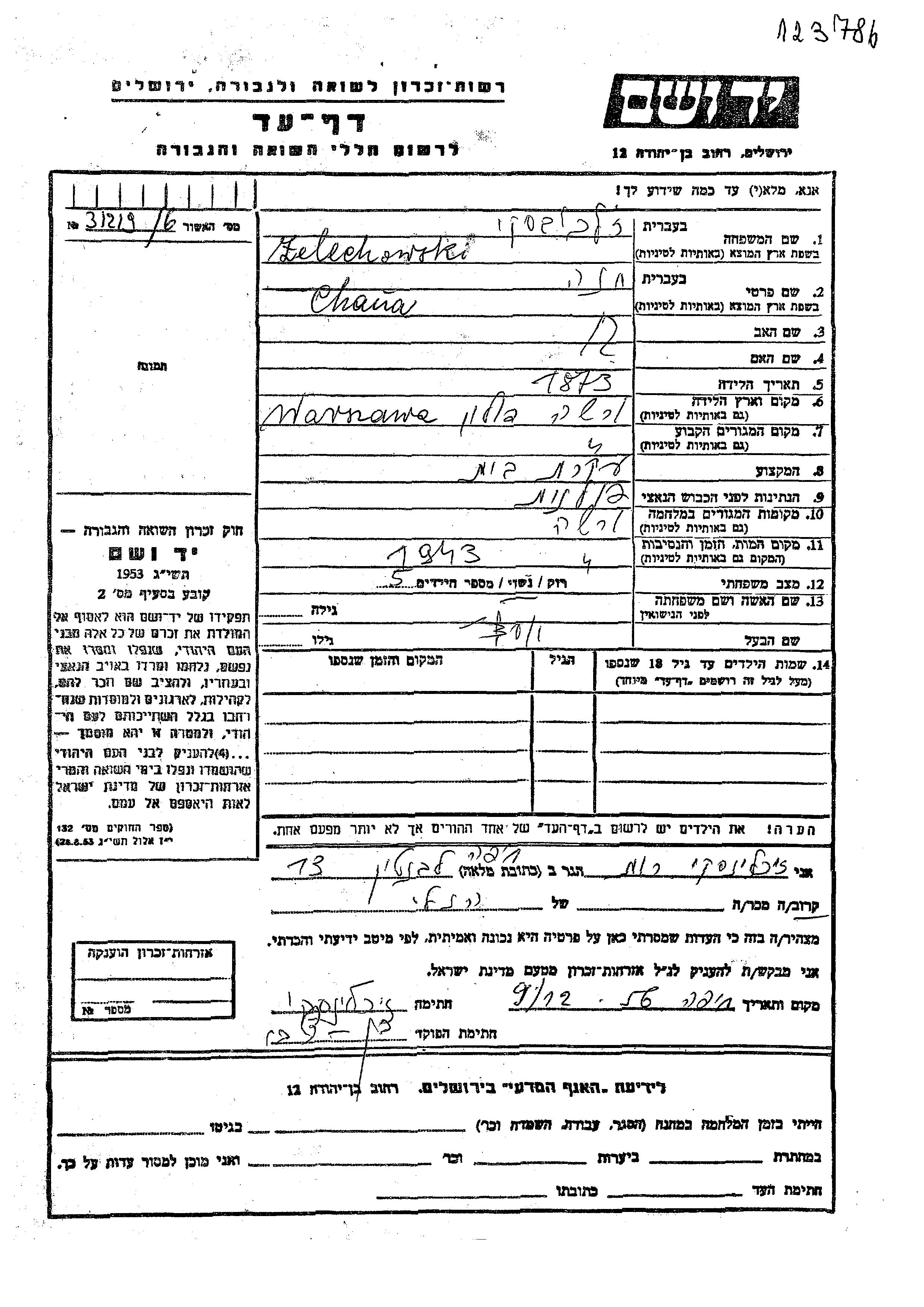 חנה Zelechowski נולדה בWarszawa שבפולין בשנת 1873. היא היתה עקרת בית ונשואה ליוסף. לפני מלחמת העולם השניה התגוררה בWarszawa שבפולין. בזמן המלחמה היא היתה בWarszawa שבפולין. חנה נרצחה בשואה. מקום המוות: Warszawa שבפולין בשנת 1943.