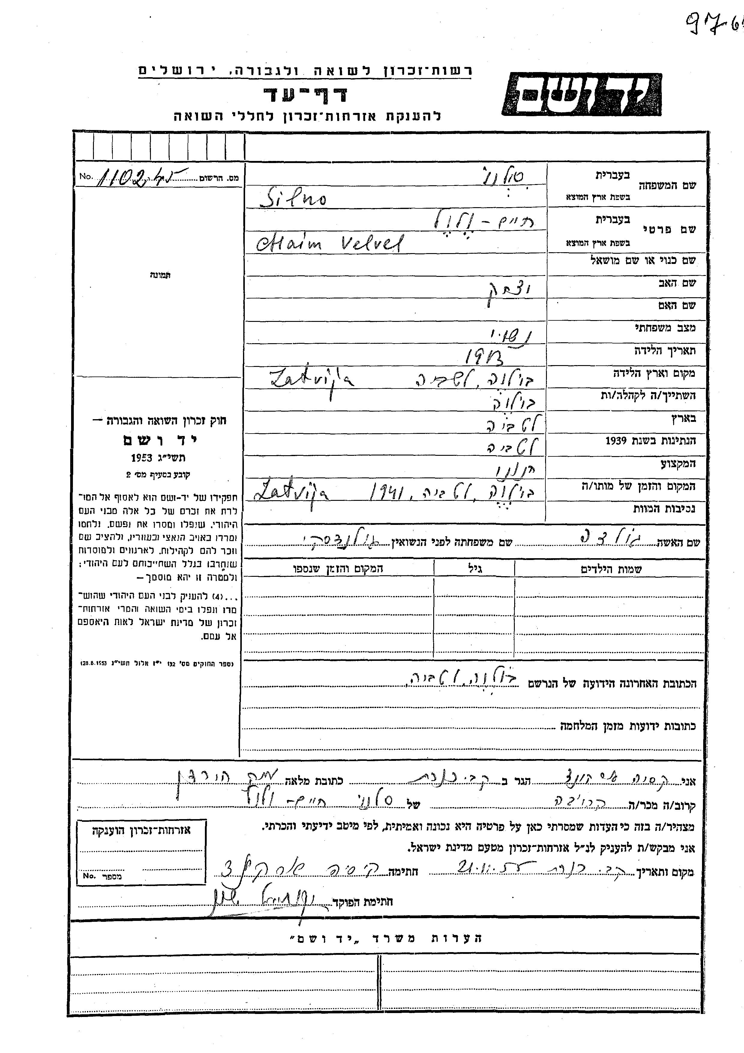 חיים Velvel סילנו נולד בBolve שבלטביה בשנת 1913 ליצחק. הוא היה חנווני. לפני מלחמת העולם השניה התגורר בBolve שבלטביה. בזמן המלחמה הוא היה בBolve שבלטביה.