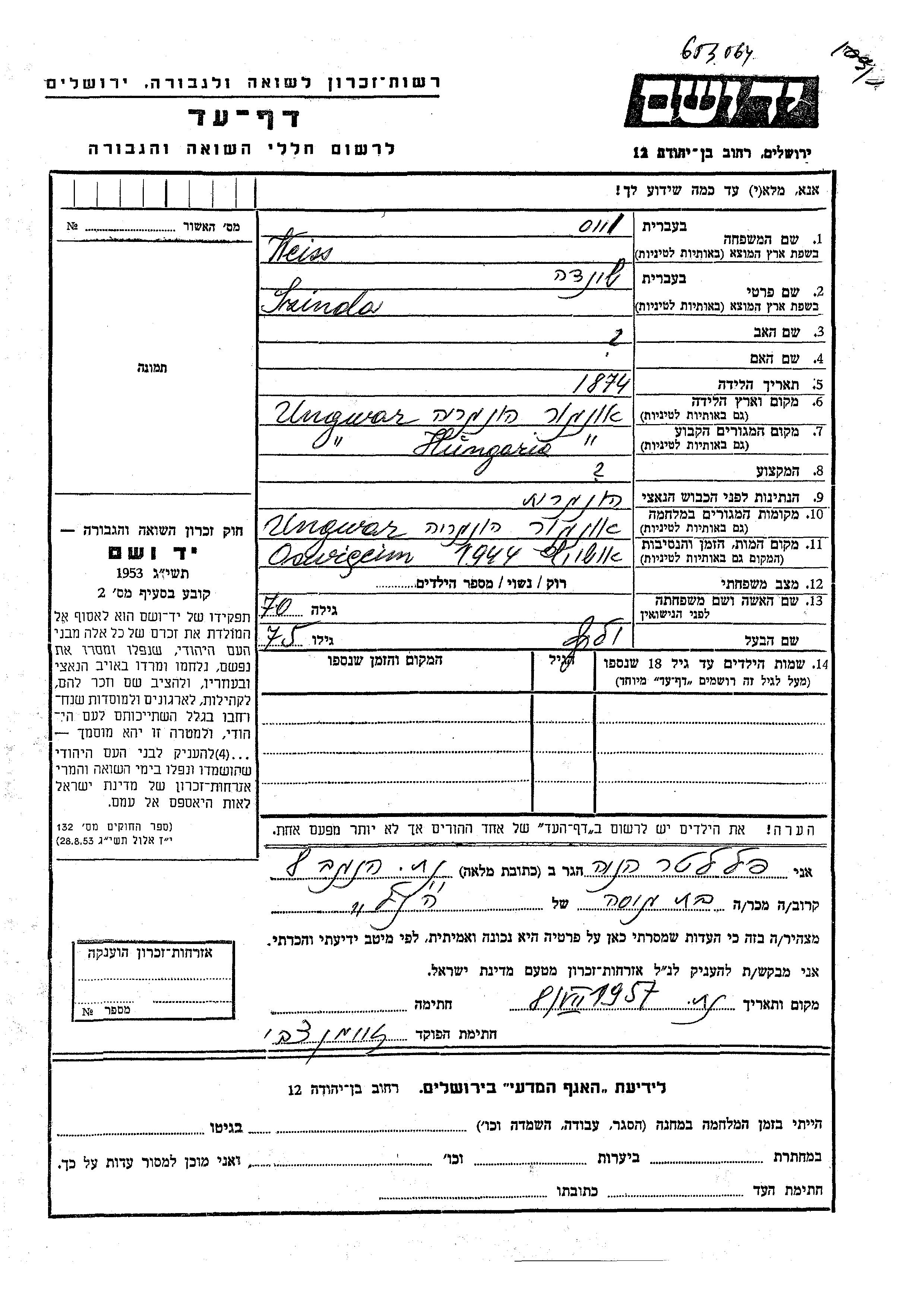 Szinda שינדה Weiss נולדה בUngwar שבצ'כוסלובקיה בשנת 1874. היא היתה נשואה לולף. לפני מלחמת העולם השניה התגוררה בUngwar שבצ'כוסלובקיה. בזמן המלחמה היא היתה בUngwar שבצ'כוסלובקיה. היא נרצחה בשואה. מקום המוות: Auschwitz שבפולין בשנת 1944.