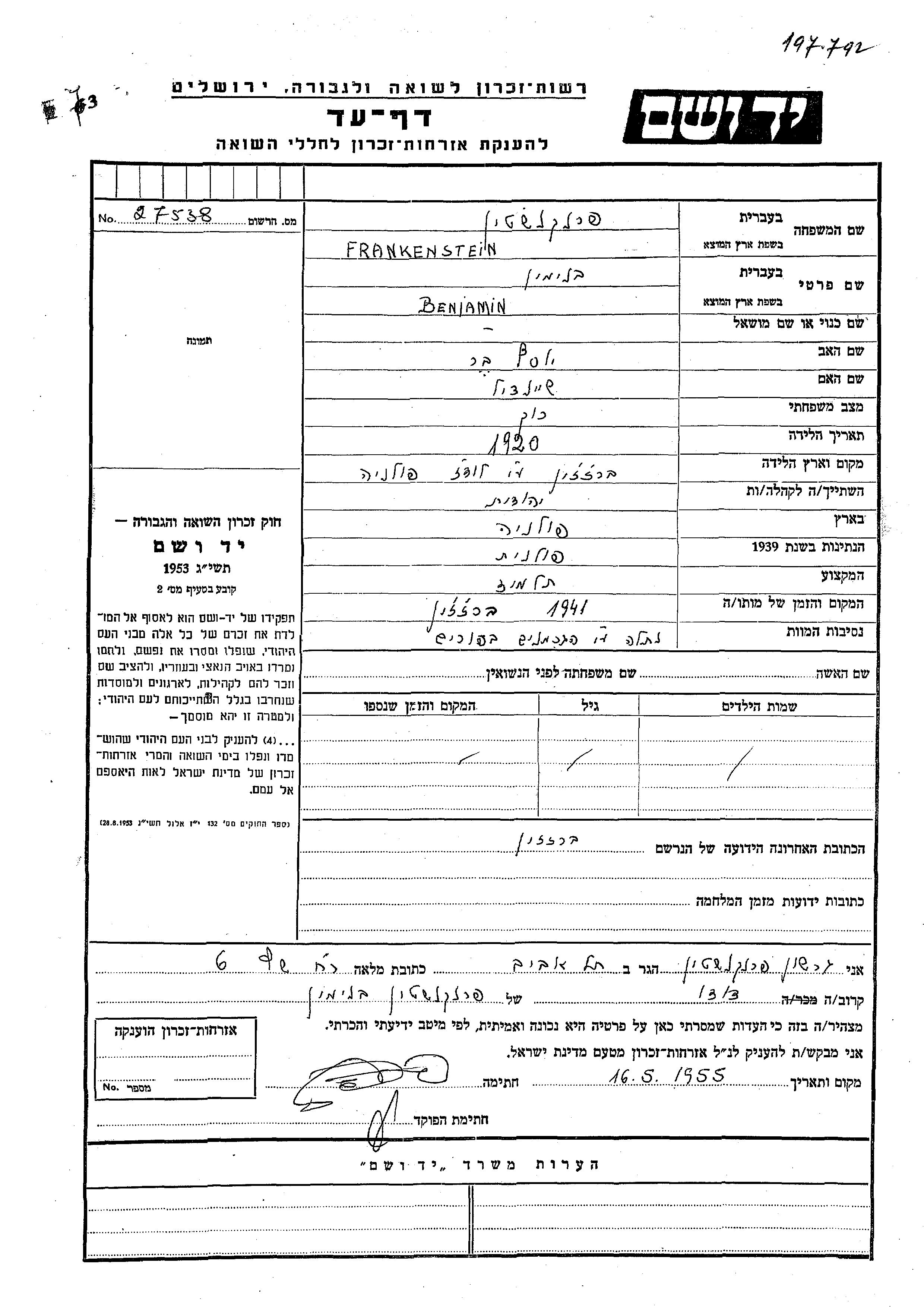 Frankenstein Benjamin 1920 Brzezin, פולין דף-עד