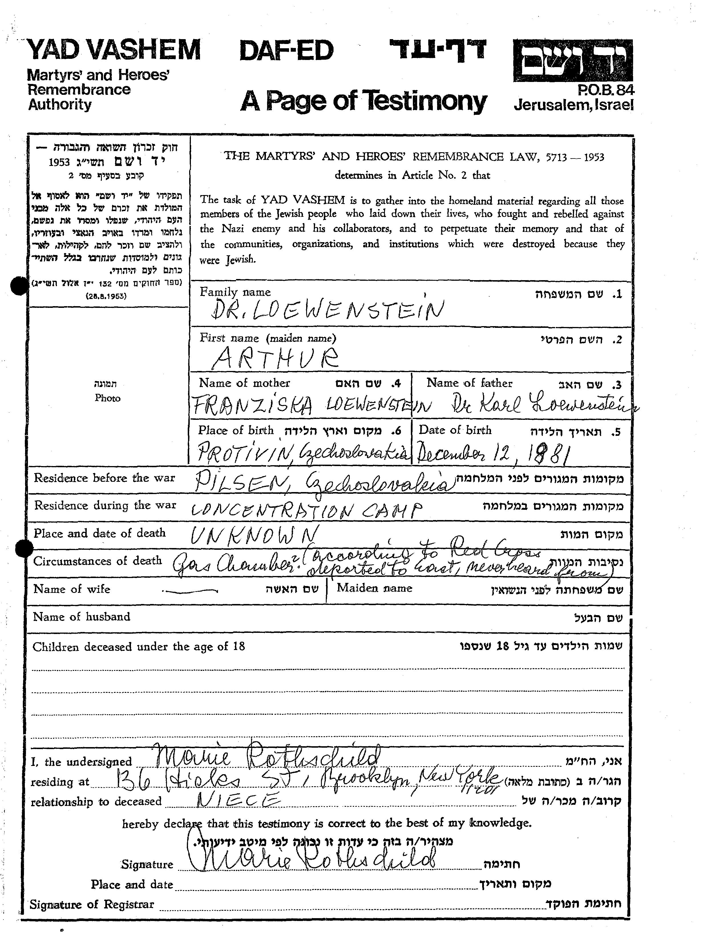 דר. Arthur Loewenstein נולד בProtivin שבצ'כוסלובקיה בשנת 1881 לKarl וFranziska. לפני מלחמת העולם השניה התגורר בPilsen שבצ'כוסלובקיה. בזמן המלחמה הוא היה במחנה,<>. דר. Loewenstein נרצח בשואה.