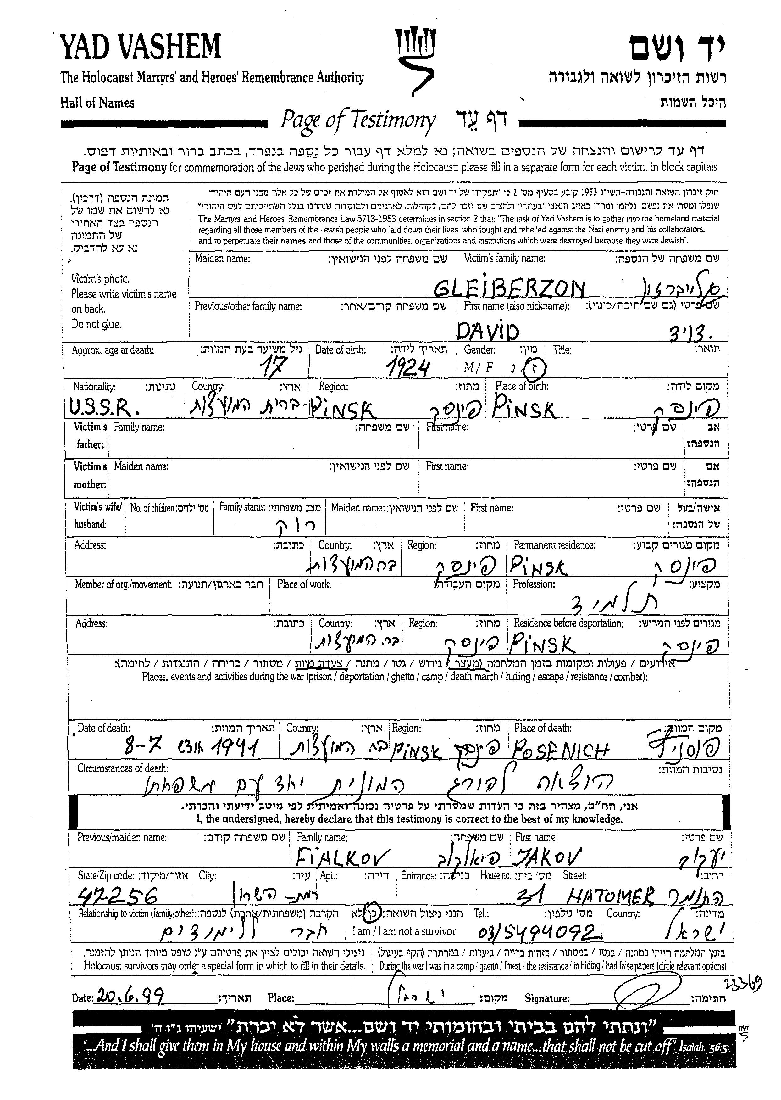 דוד גלייברזון נולד בPinsk שבפולין בשנת 1924. הוא היה תלמיד ורווק. לפני מלחמת העולם השניה התגורר בPinsk שבפולין. בזמן המלחמה הוא היה בPinsk שבפולין.