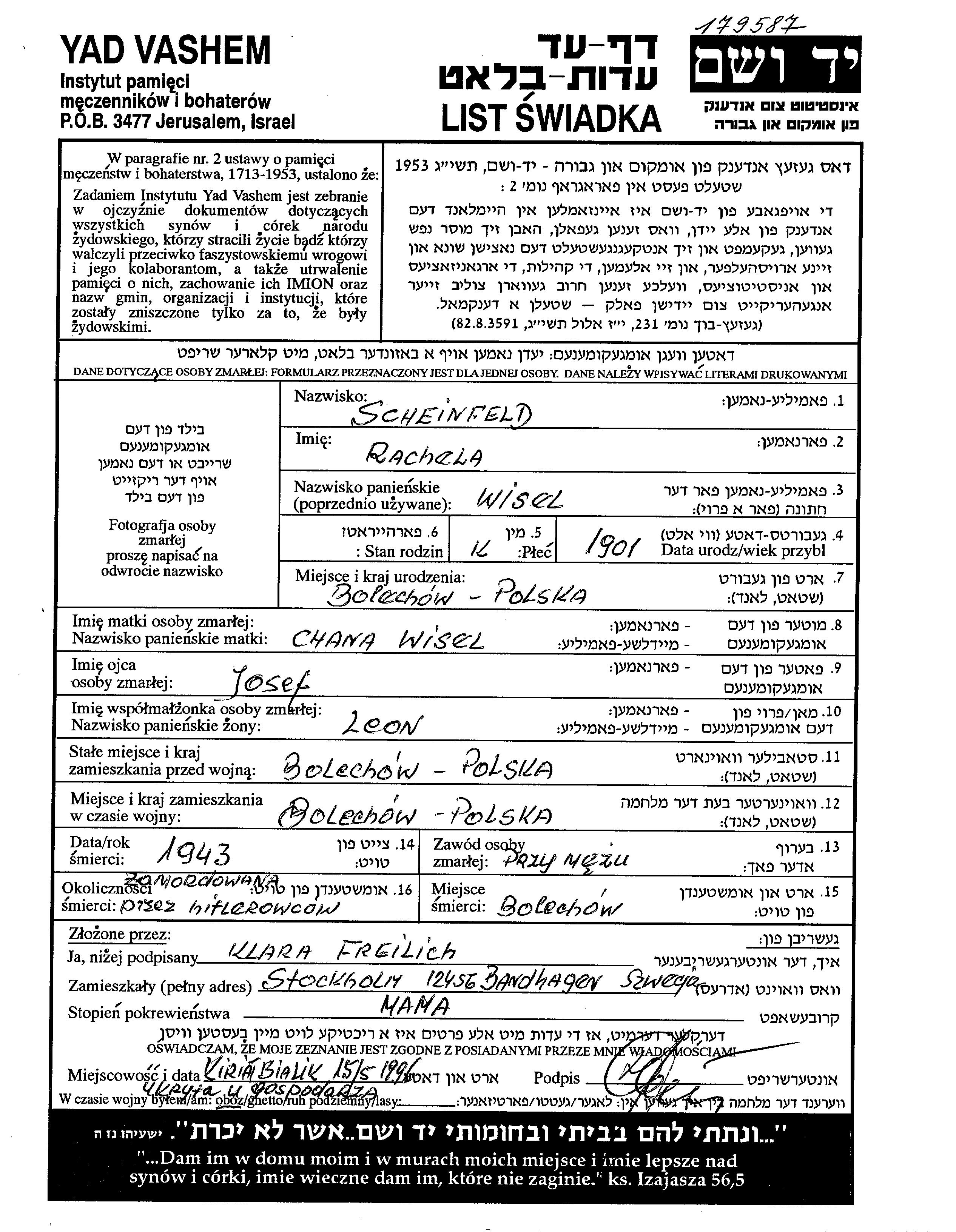 Rachela Scheinfeld לבית Wisel נולדה בBolechow שבפולין בשנת 1901 לJosef וחנה. היא היתה בורסקי ונשואה ללאון. לפני מלחמת העולם השניה התגוררה בBolechow שבפולין. בזמן המלחמה היא היתה בBolechow שבפולין.