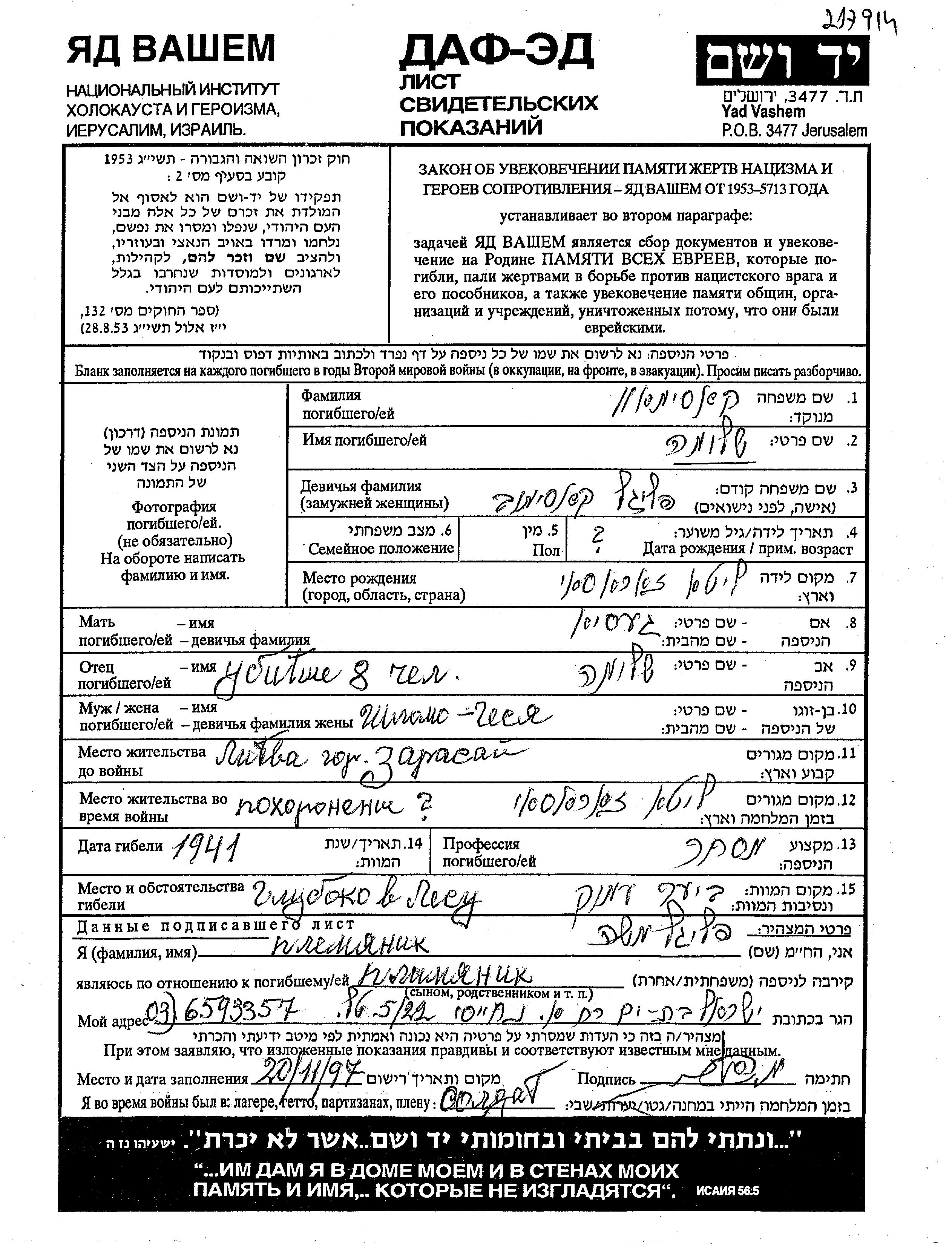 שלמה נרצח בשואה. מקום המוות: ליטא בשנת 1941.