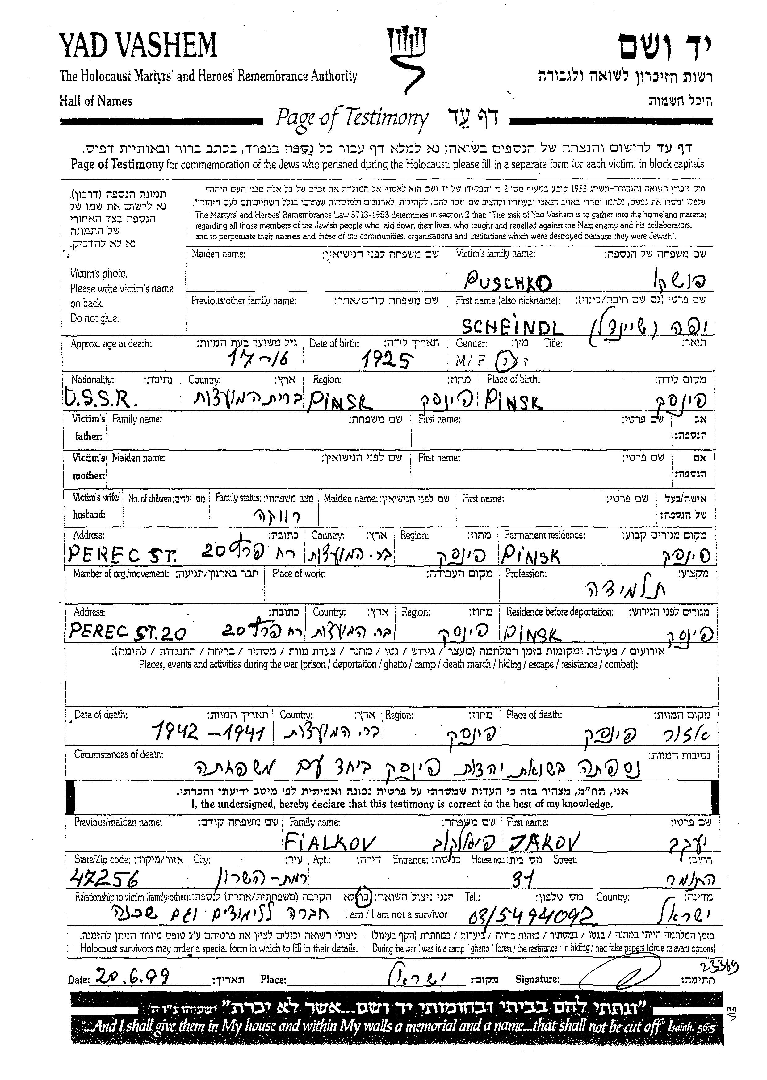 Sheindl יפה Puschko פושקו נולדה בPinsk שבפולין בשנת 1925. היא היתה תלמידה ורווקה. לפני מלחמת העולם השניה התגוררה בPinsk שבפולין. בזמן המלחמה היא היתה בPinsk שבפולין.