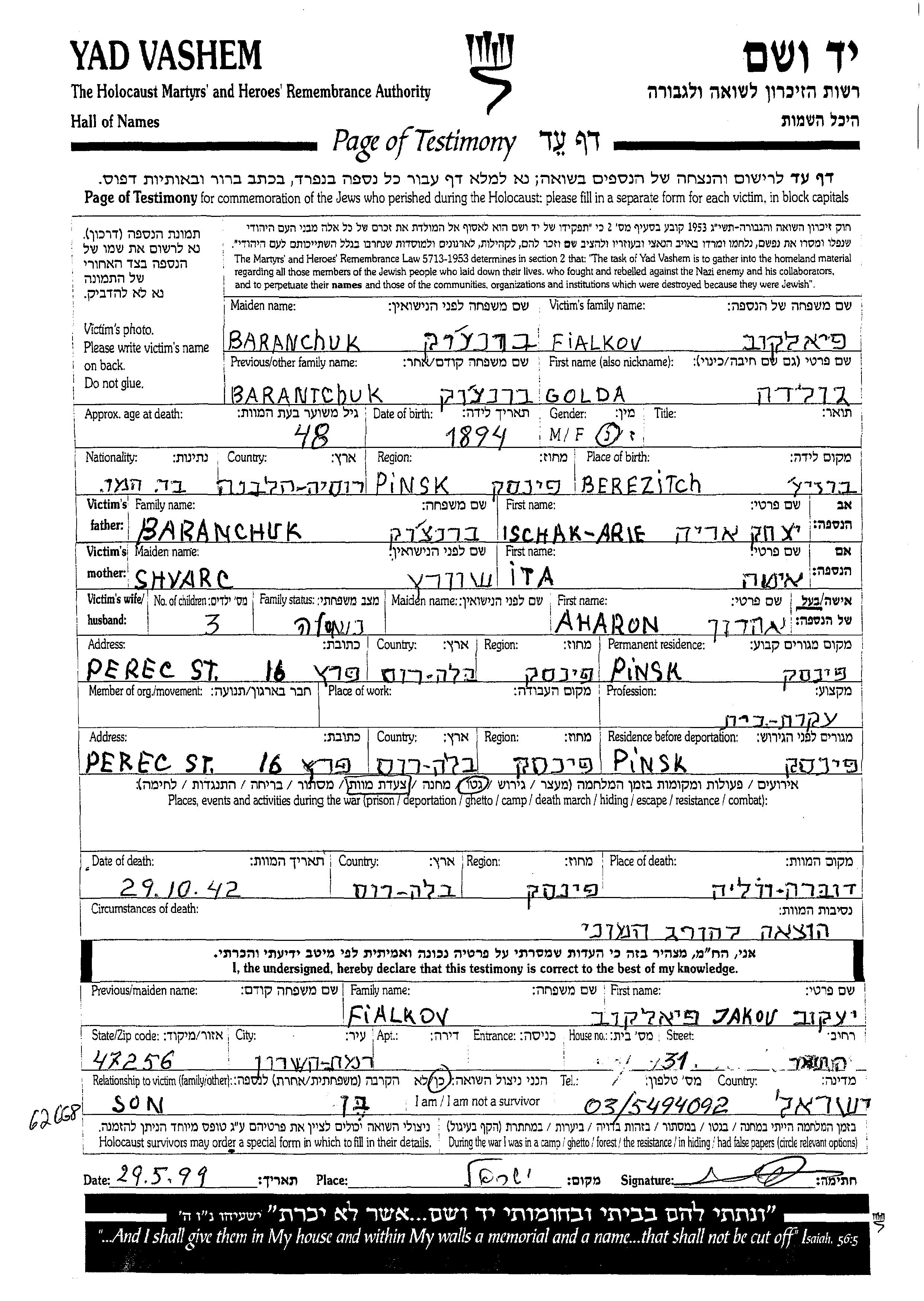 גולדה פיאלקוב לבית ברנצוק נולדה בBerezich שבפולין בשנת 1894 לIschak אריה ואיטה. היא היתה עקרת בית ונשואה לאהרן. לפני מלחמת העולם השניה התגוררה בPinsk שבפולין. בזמן המלחמה היא היתה בPinsk שבפולין.