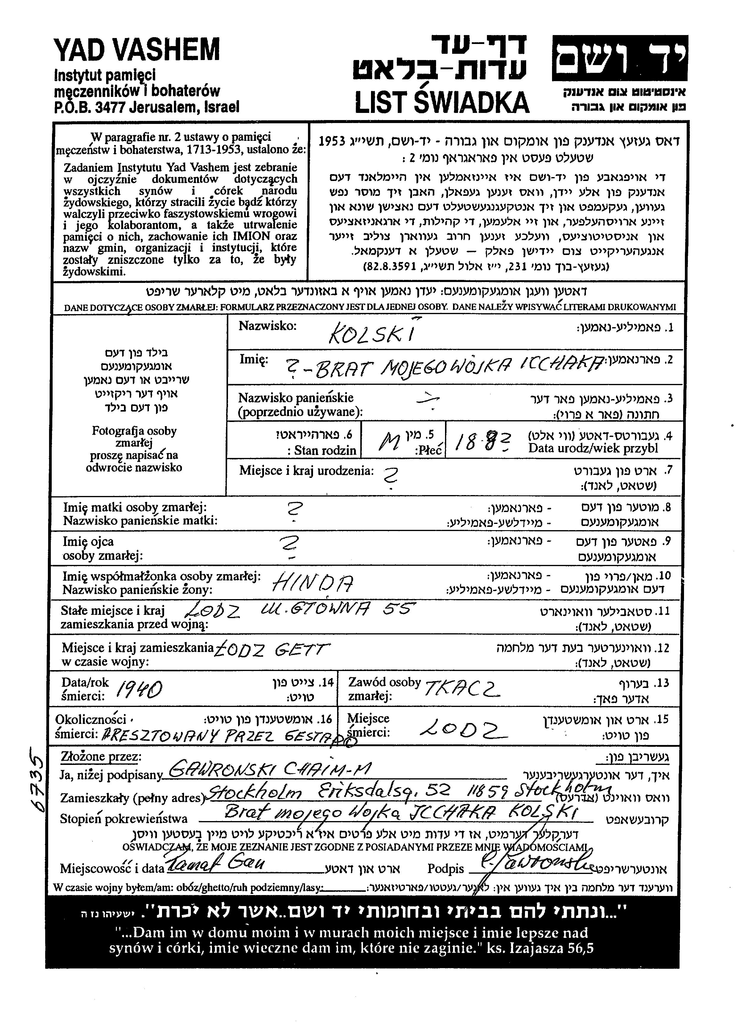 שם פרטי לא ידוע קולסקי. היא היתה אורגת ונשואה להינדה. לפני מלחמת העולם השניה התגוררה בLodz שבפולין. בזמן המלחמה היא היתה בLodz שבפולין. היא נרצחה בשואה. מקום המוות: Lodz שבפולין בשנת 1940.