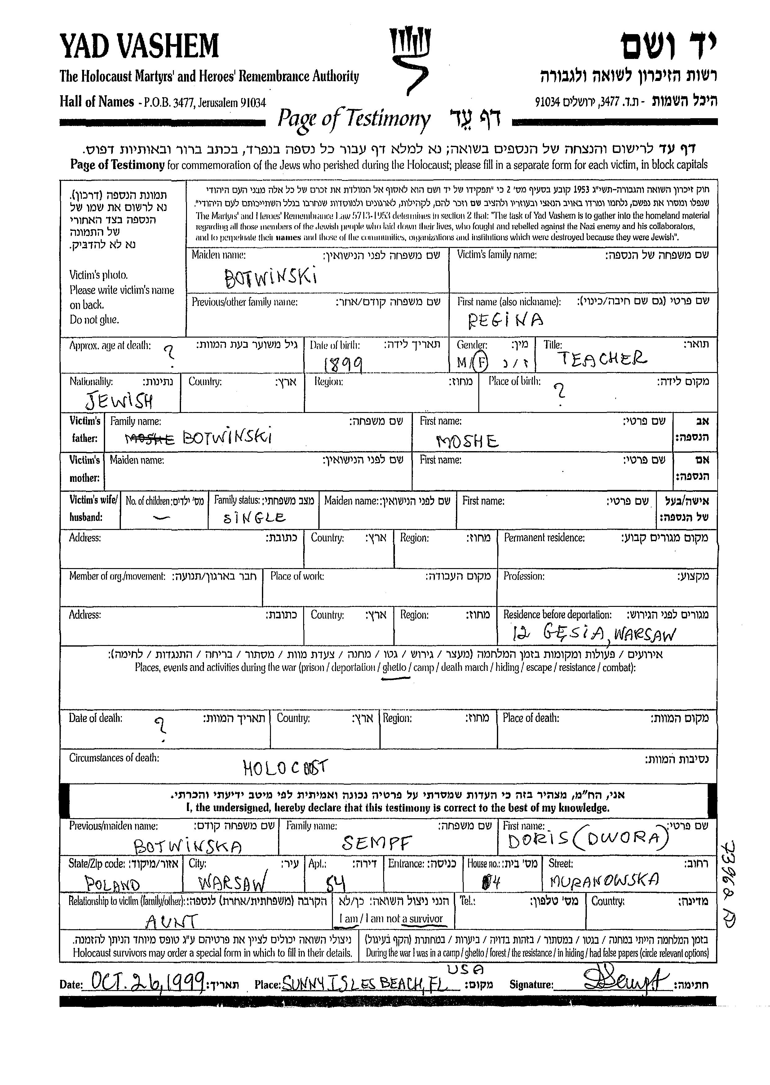 רגינה Botwinski נולדה בשנת 1899 למשה. היא היתה מורה ורווקה. בזמן המלחמה היא היתה בWarsaw שבפולין.