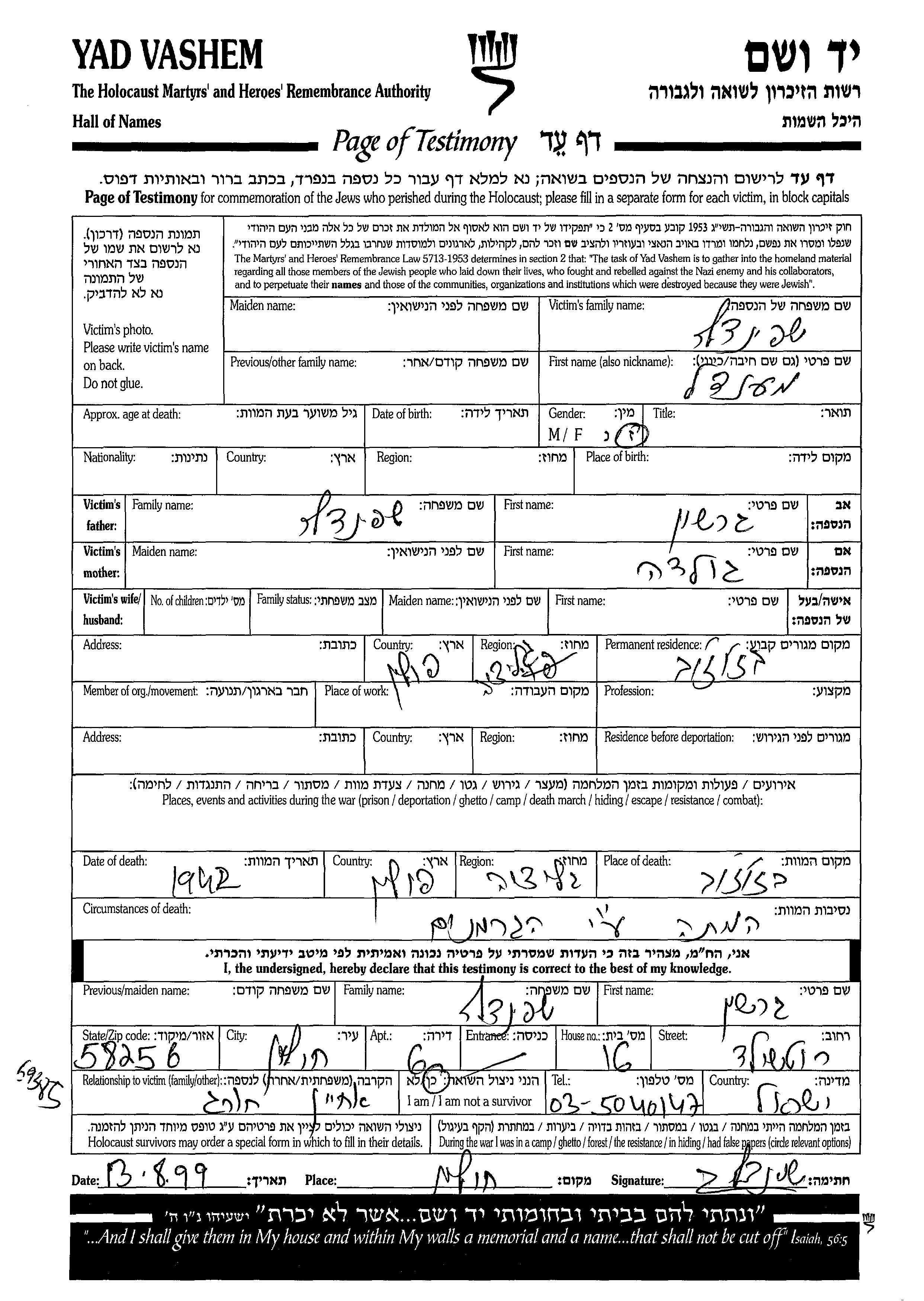 מענדל נרצח בשואה. מקום המוות: Brzozow שבפולין בשנת 1942.