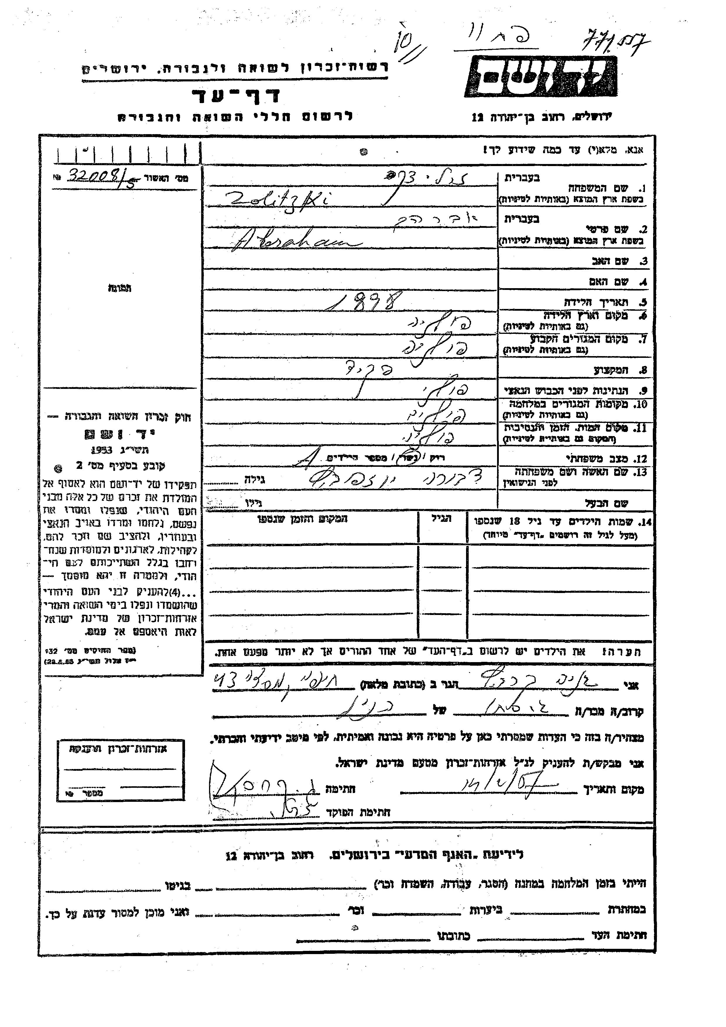 Abraham זוליצקי נולד בפולין בשנת 1898. הוא היה פקיד ונשוי לדבורה לבית יוזפוביץ. לפני מלחמת העולם השניה התגורר בפולין. בזמן המלחמה הוא היה בפולין.