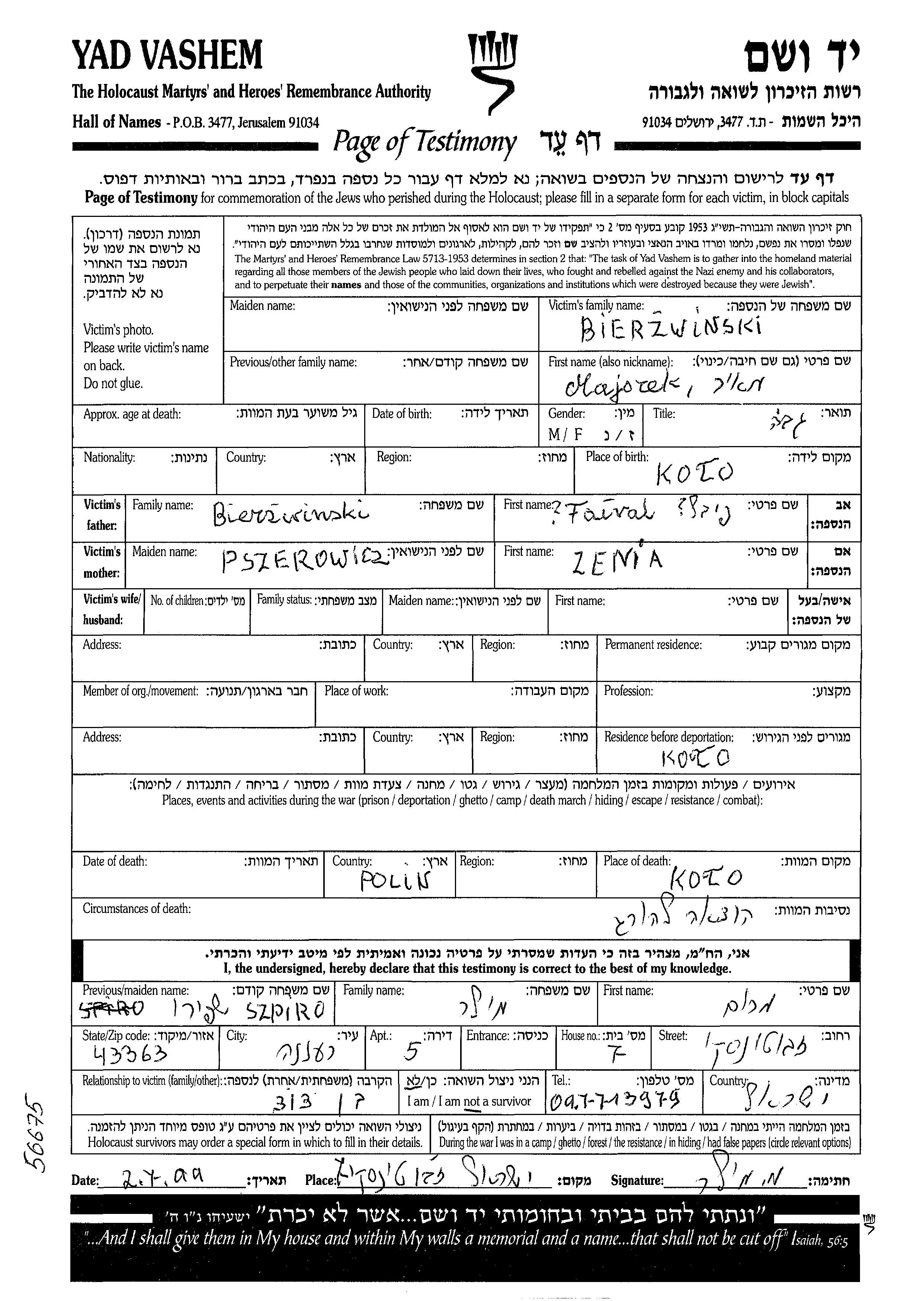 מאיורק נרצח בשואה. מקום המוות: Kolo שבפולין.