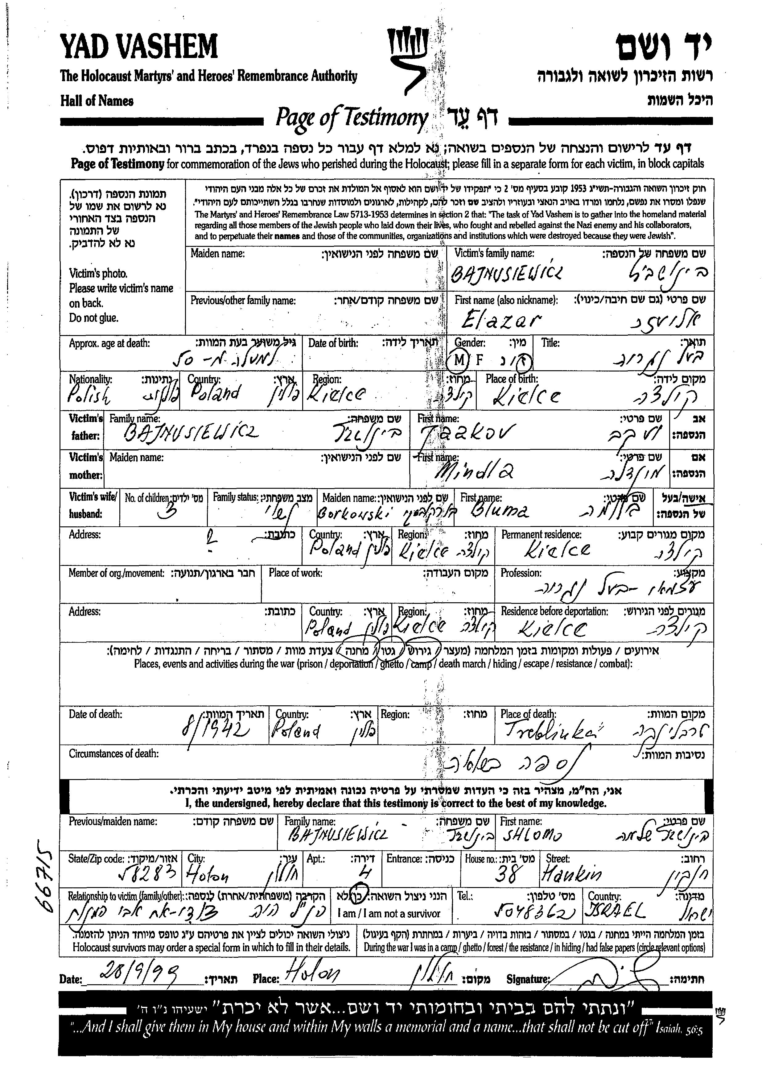 אלעזר Bajnusiewicz נולד בKielce שבפולין לJaakov וMindla. הוא היה בעל נגריה ונשוי לבלומה לבית Borkowski בורקובסקי. לפני מלחמת העולם השניה התגורר בKielce שבפולין. בזמן המלחמה הוא היה בKielce שבפולין. אלעזר נרצח בשואה. מקום המוות: Treblinka שבפולין בשנת 1942.