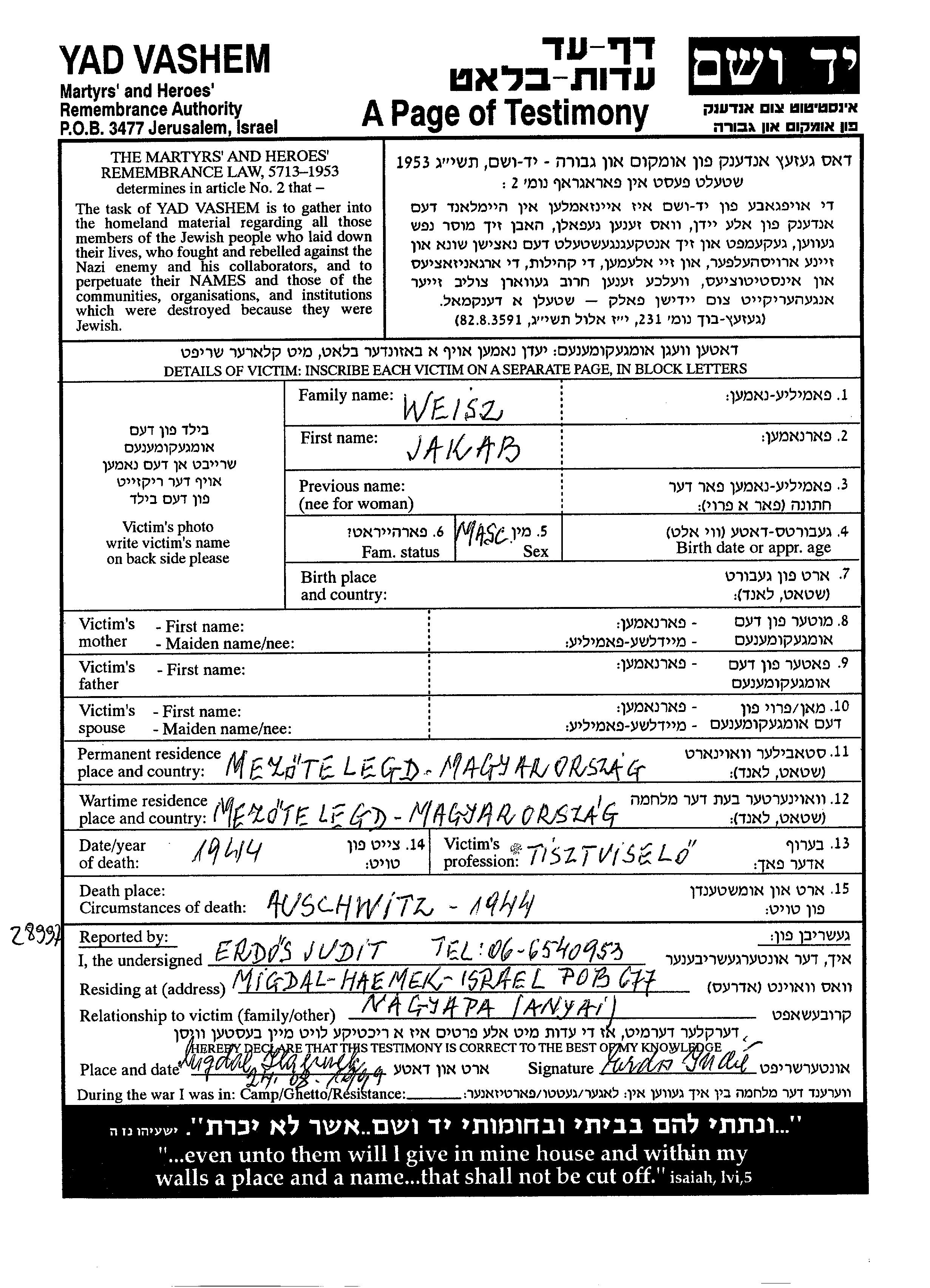 Jakab Weisz. הוא היה פקיד. לפני מלחמת העולם השניה התגורר בMezotelegd שברומניה. בזמן המלחמה הוא היה בMezotelegd שברומניה.