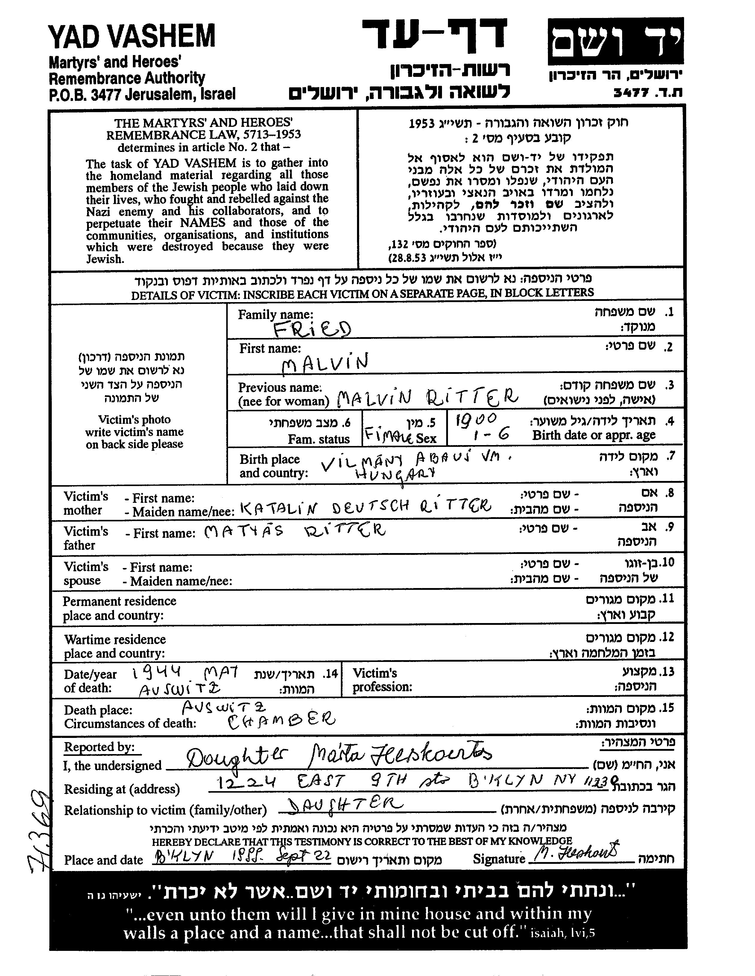 מלוין Fried לבית Ritter נולדה בVilmany שבהונגריה בשנת 1900 לMatyas וקטלין.
