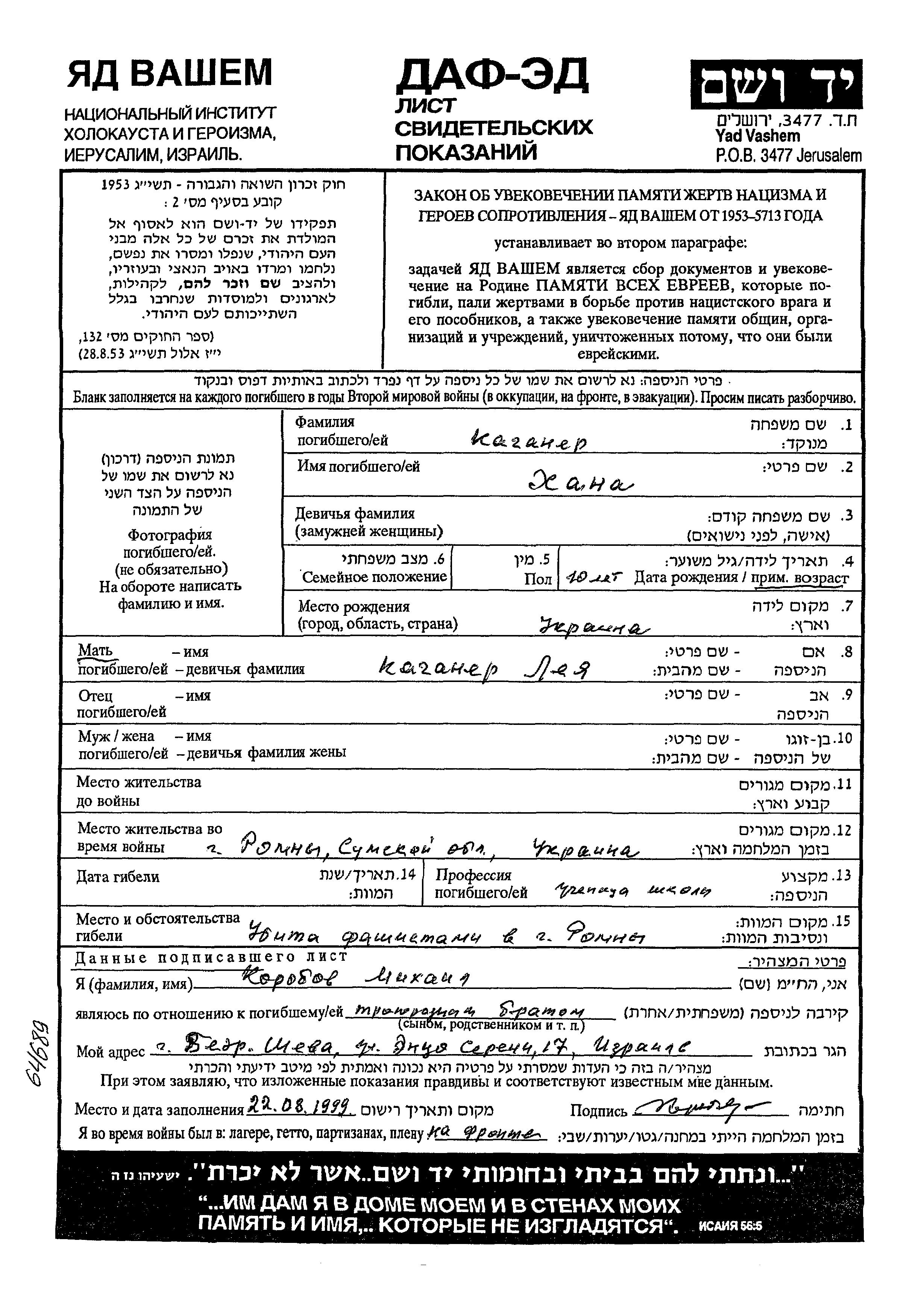 חנה Kaganer נולדה באוקראינה (ברה"מ) לLeya. היא היתה תלמידה וילדה. בזמן המלחמה היא היתה בRomny שבאוקראינה (ברה"מ).