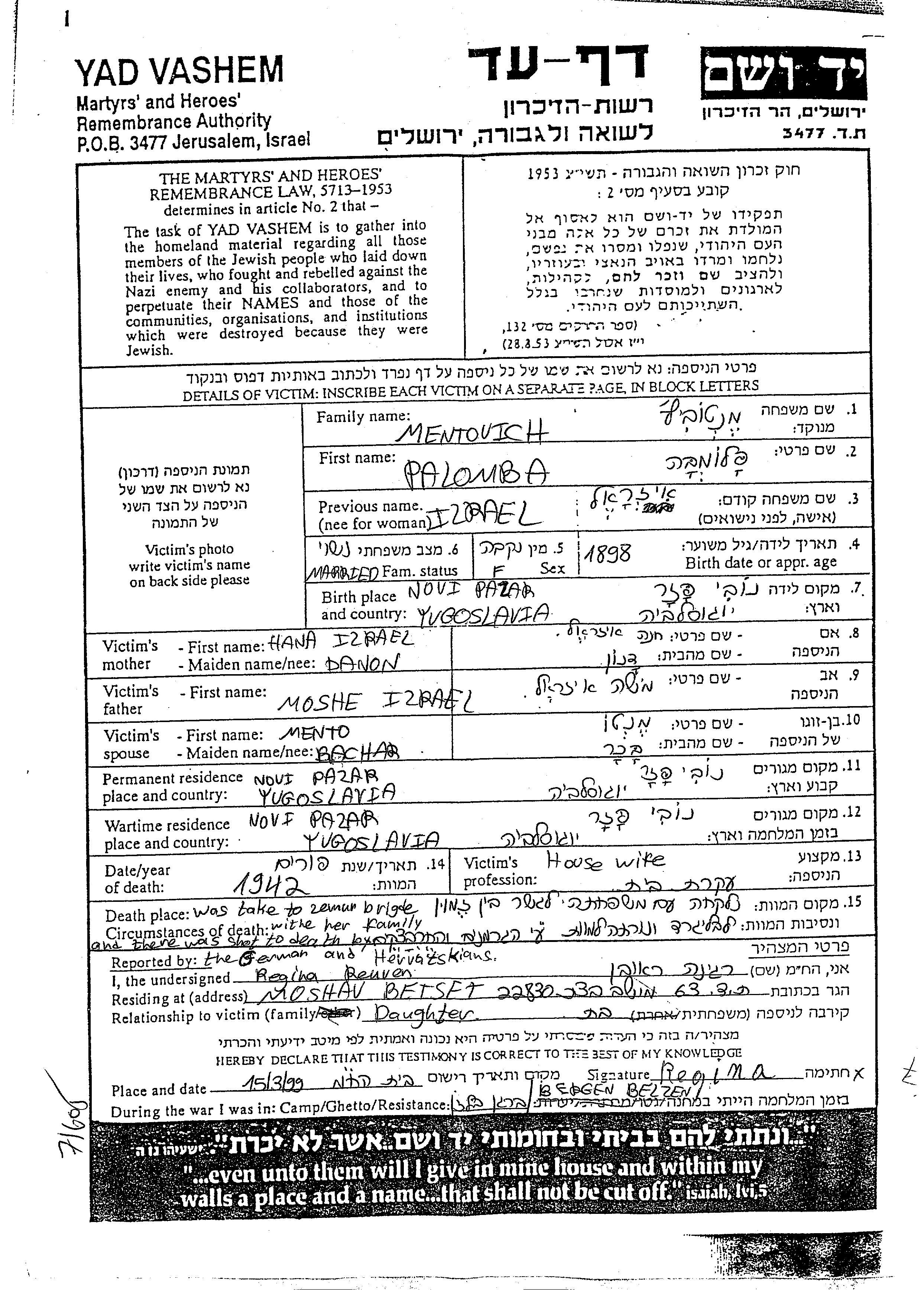 Palomba Mentovich לבית Izrael נולדה בNovi Pazar שביוגוסלביה בשנת 1898 למשה והנה. היא היתה עקרת בית ונשואה לMento Bachar. לפני מלחמת העולם השניה התגוררה בNovi Pazar שביוגוסלביה. בזמן המלחמה היא היתה בNovi Pazar שביוגוסלביה.