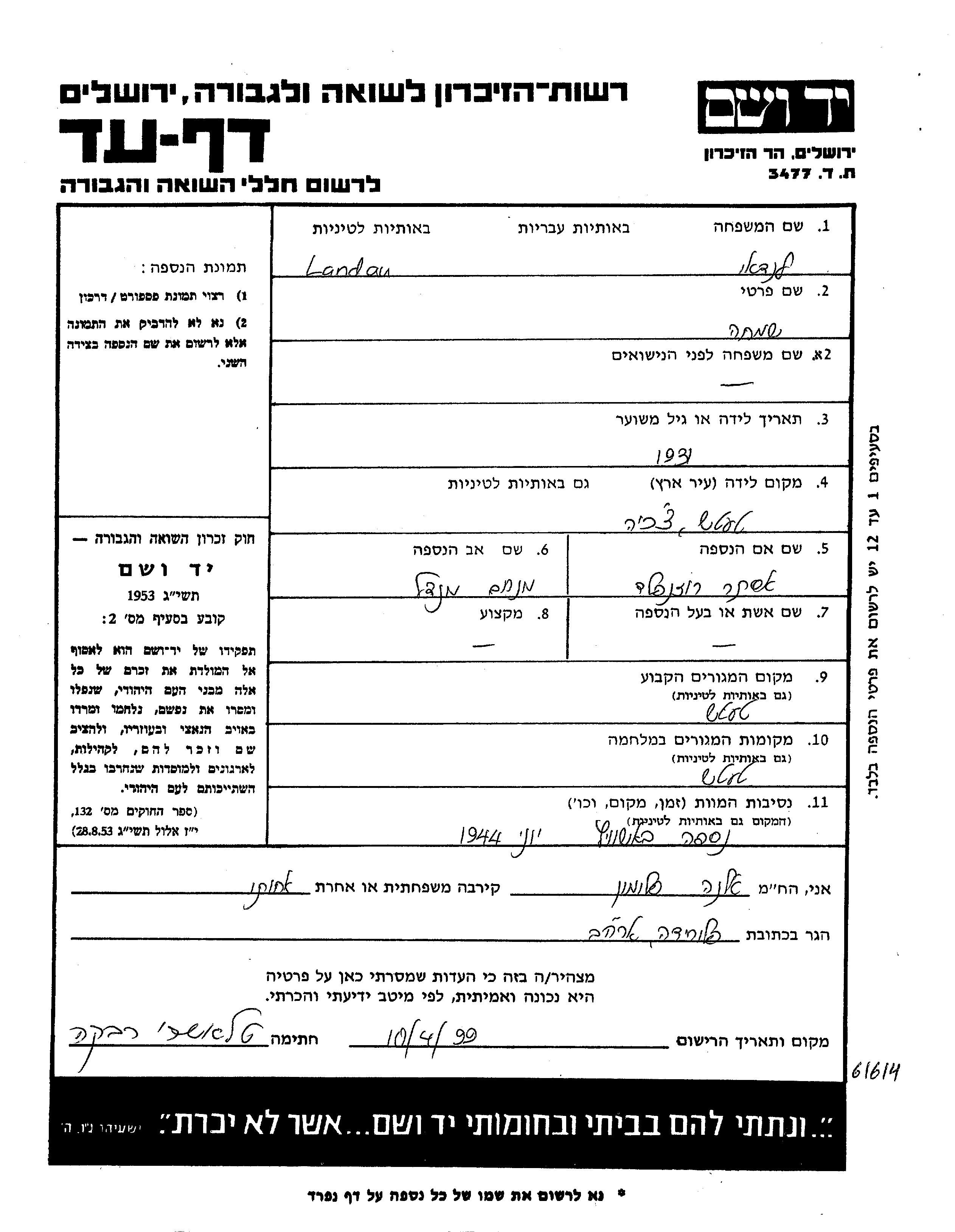שמחה לנדאו נולד בTatsic שבצ'כוסלובקיה בשנת 1931 למנחם מנדל ואסתר. לפני מלחמת העולם השניה התגורר בTatsic שבצ'כוסלובקיה. בזמן המלחמה הוא היה בTatsic שבצ'כוסלובקיה. שמחה נרצח בשואה. מקום המוות: Auschwitz שבפולין בשנת 1944.