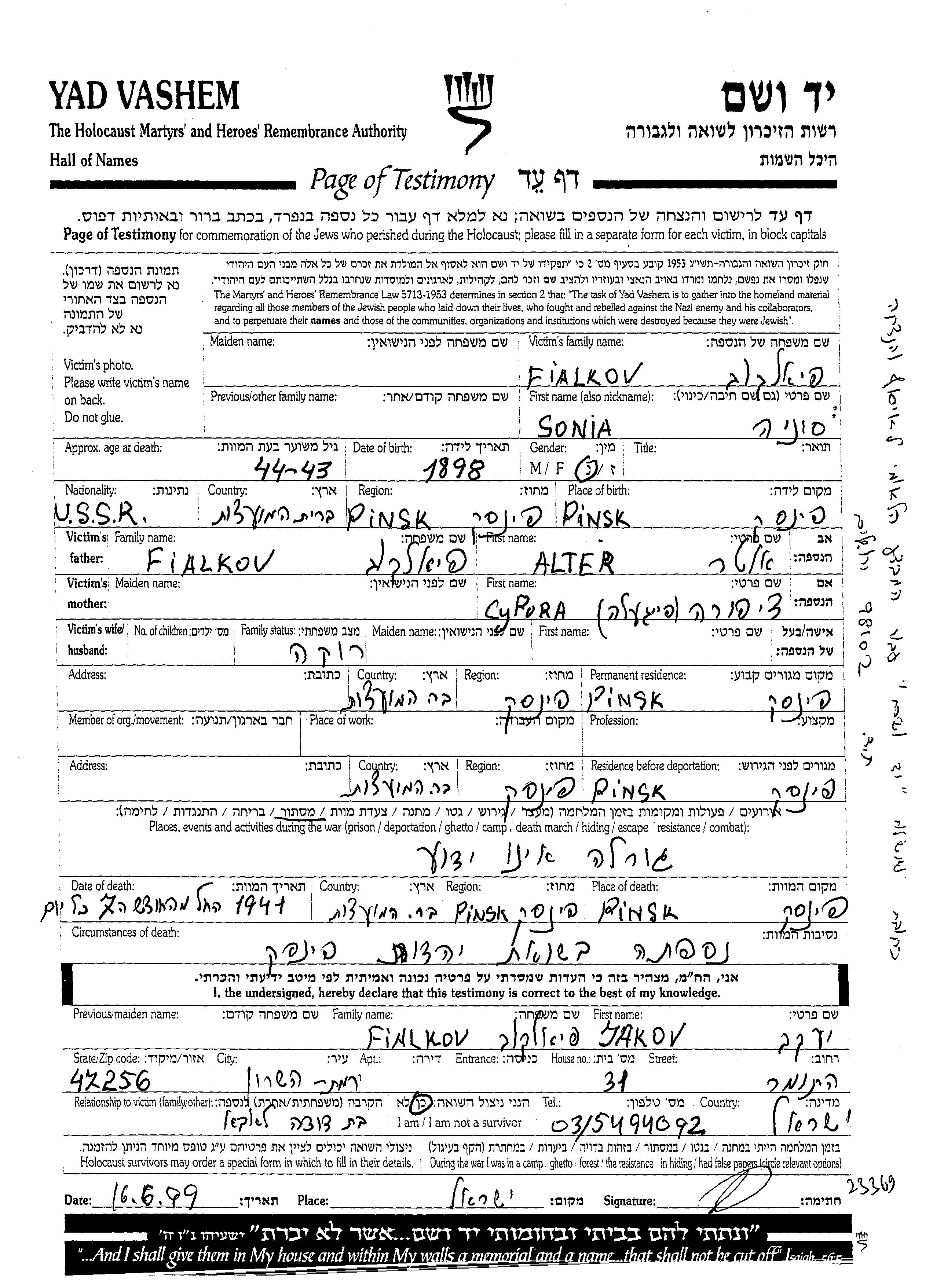 סוניה פיאלקוב נולדה בPinsk שבפולין בשנת 1898 לאלטר וCypora פייגעלה. היא היתה רווקה. לפני מלחמת העולם השניה התגוררה בPinsk שבפולין. בזמן המלחמה היא היתה בPinsk שבפולין. סוניה נרצחה בשואה. מקום המוות: Pinsk שבפולין בשנת 1941.