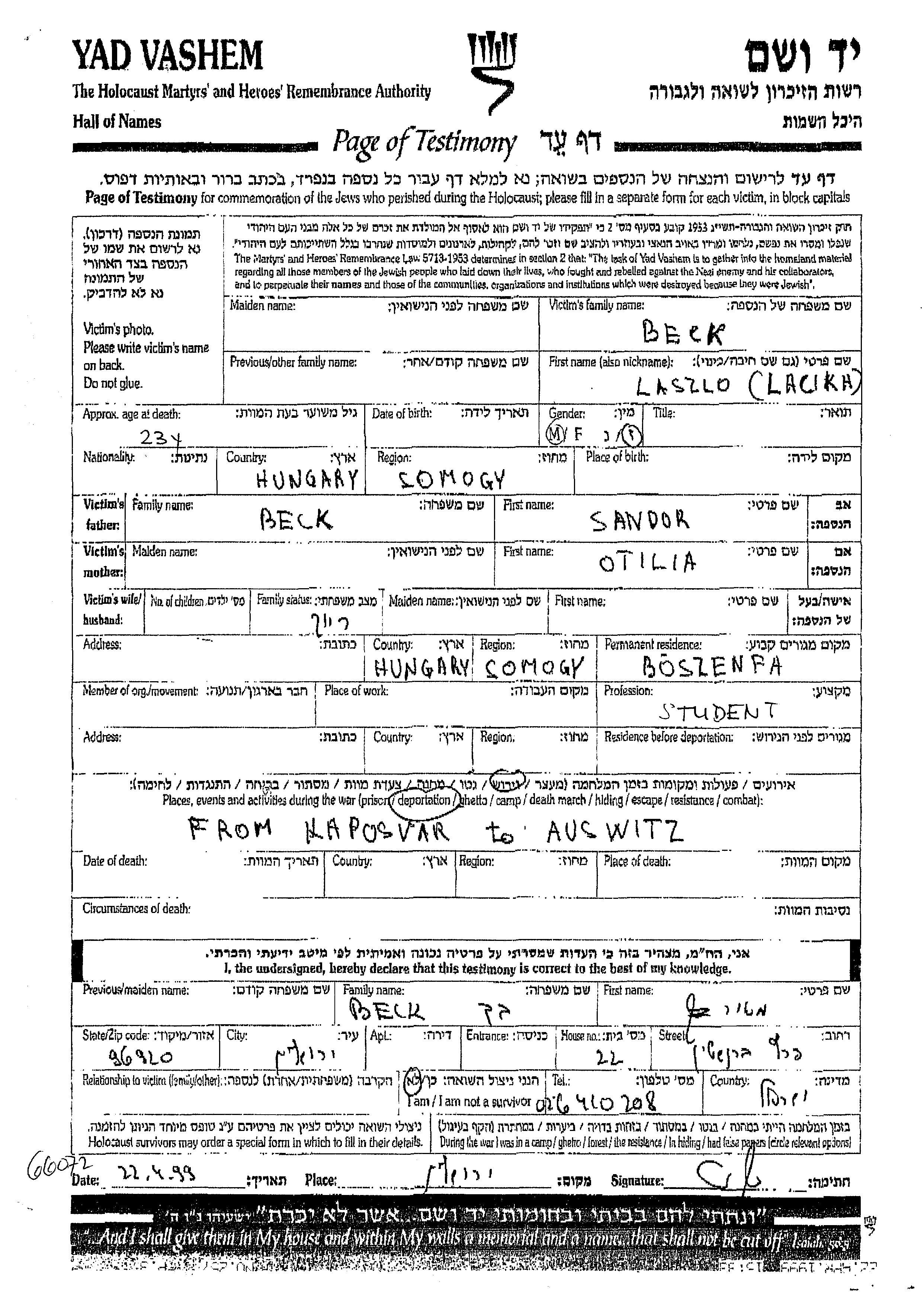 Laszlo Beck נולד בSomogy שבהונגריה לסנדור ואוטיליה. הוא היה סטודנט ורווק. לפני מלחמת העולם השניה התגורר בBoszenfa שבהונגריה. בזמן המלחמה הוא היה בKaposvar שבהונגריה.
