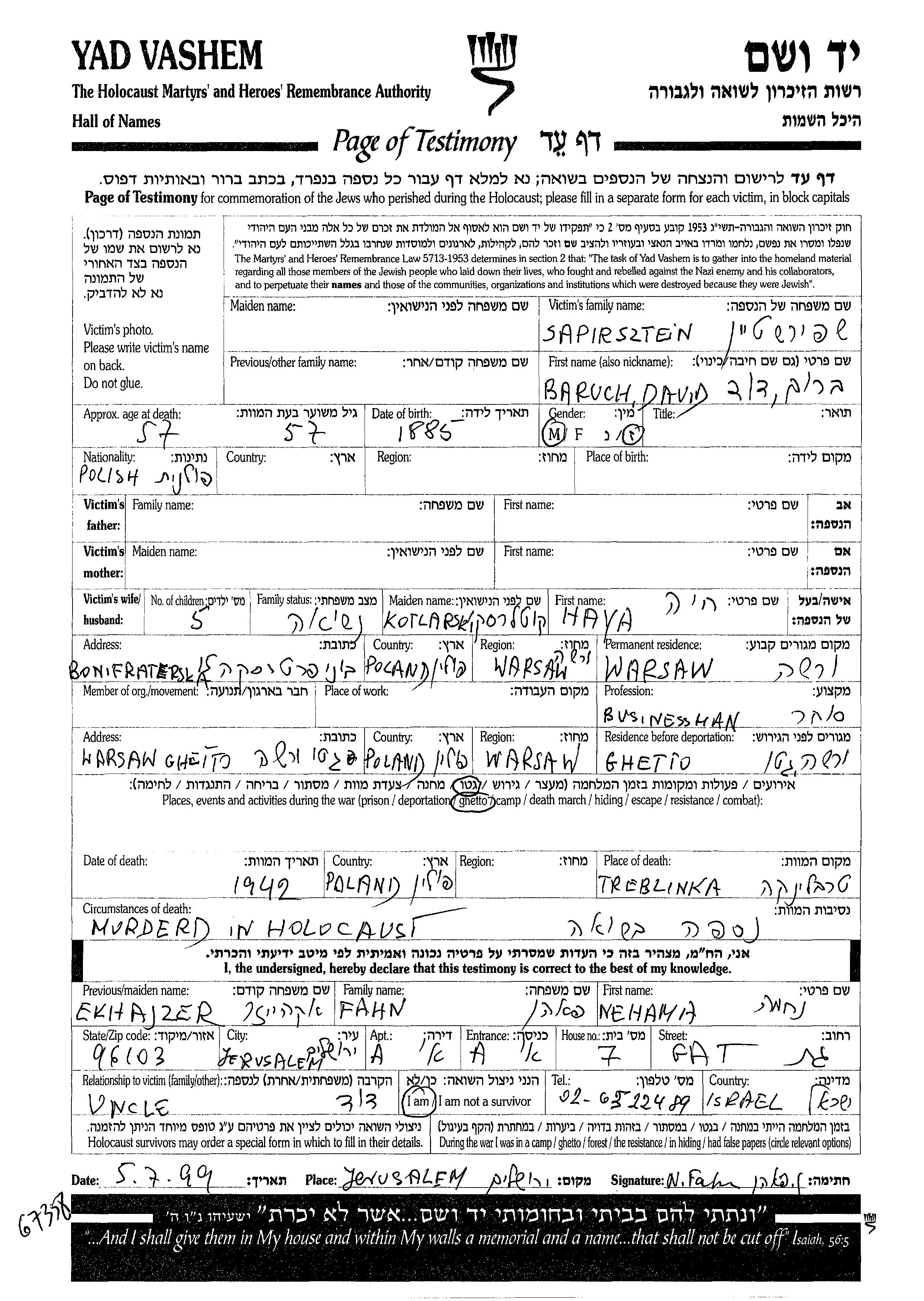 ברוך דוד Sapirsztein נולד בשנת 1885. הוא היה סוחר ונשוי לHaya לבית קוטלרסקי. לפני מלחמת העולם השניה התגורר בWarszawa שבפולין. בזמן המלחמה הוא היה בWarszawa שבפולין.