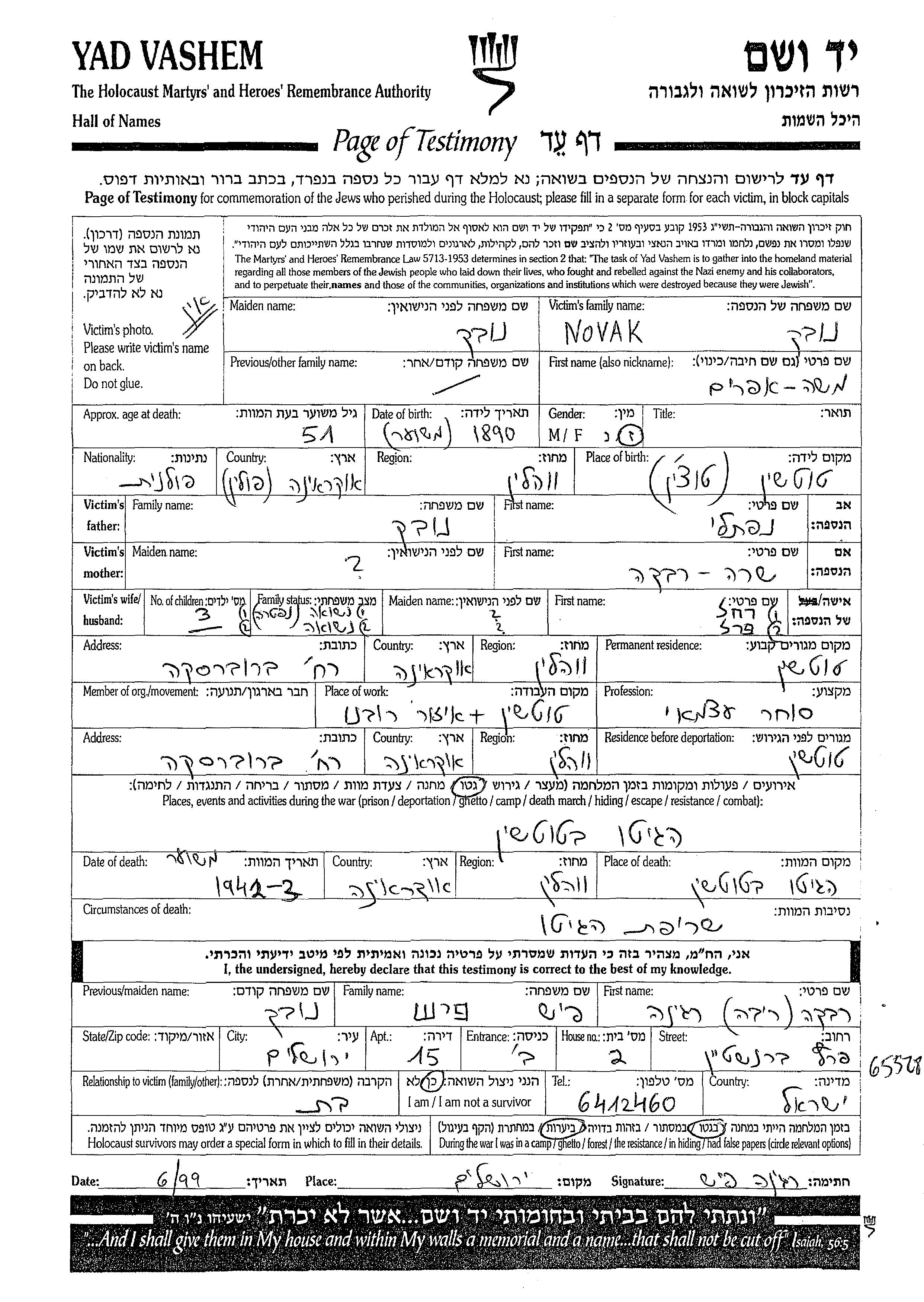 משה אפרים נובק נולד בTuchin שבפולין בשנת 1890 לנפתלי ושרה רבקה. הוא היה סוחר ונשוי לרחל פרל. לפני מלחמת העולם השניה התגורר בTuchin שבפולין. בזמן המלחמה הוא היה בTuchin שבפולין. משה אפרים נרצח בשואה. מקום המוות: Tuczyn שבפולין בשנת 1942.