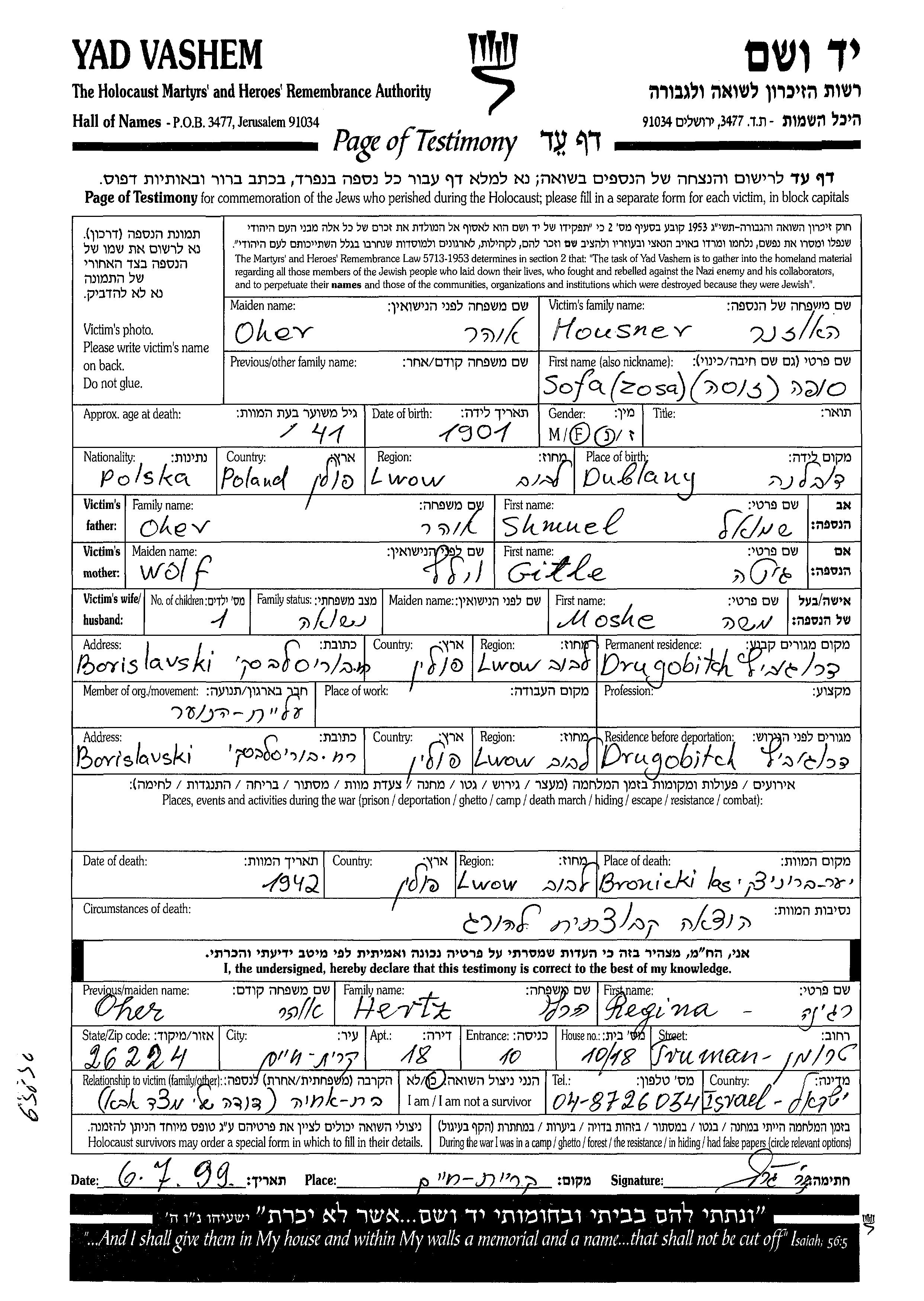 Sofa זוסה Housner לבית אוהר נולדה בDublany שבפולין בשנת 1901 לשמואל וGitle. היא היתה נשואה למשה. לפני מלחמת העולם השניה התגוררה בDrogobich שבפולין. בזמן המלחמה היא היתה בDrogobich שבפולין.